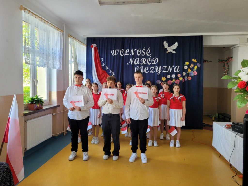 Prowadząca uroczystość konferansjerka podkreśliła rolę, jaką dla Polaków odegrało uchwalenie Konstytucji, przypomniała także nazwiska twórców tej Ustawy Rządowej. Uczniowie pięknie recytowali wiersze. Niezwykle wzruszająco wybrzmiały też słowa pieśni i piosenek, które można było usłyszeć w wykonaniu chóru szkolnego, duetów i zespołów . Były to takie utwory, jak: ,,Flaga’’, ,,Taki kraj”, ,,Nadzieja”, ,,Polonez 3 Maja”, ,,Polskie kwiaty”. Swój występ młodzi artyści zakończyli pieśnią ,,Pamięć w nas”, przy jej dźwiękach dziewczęta zatańczyły w rytm poloneza.