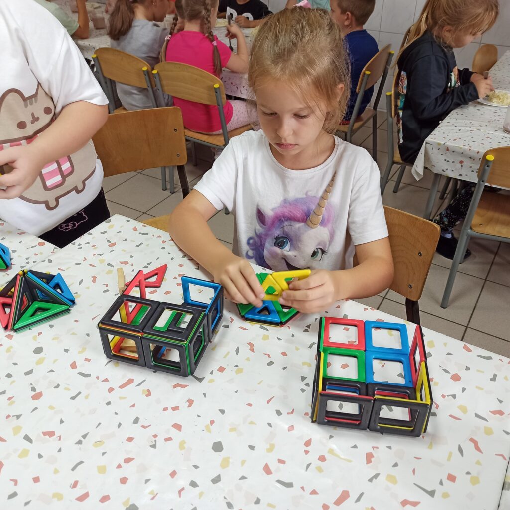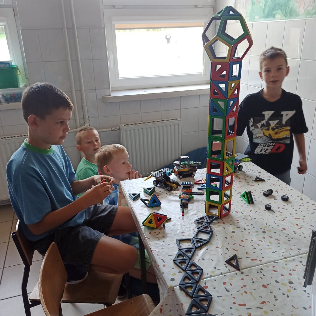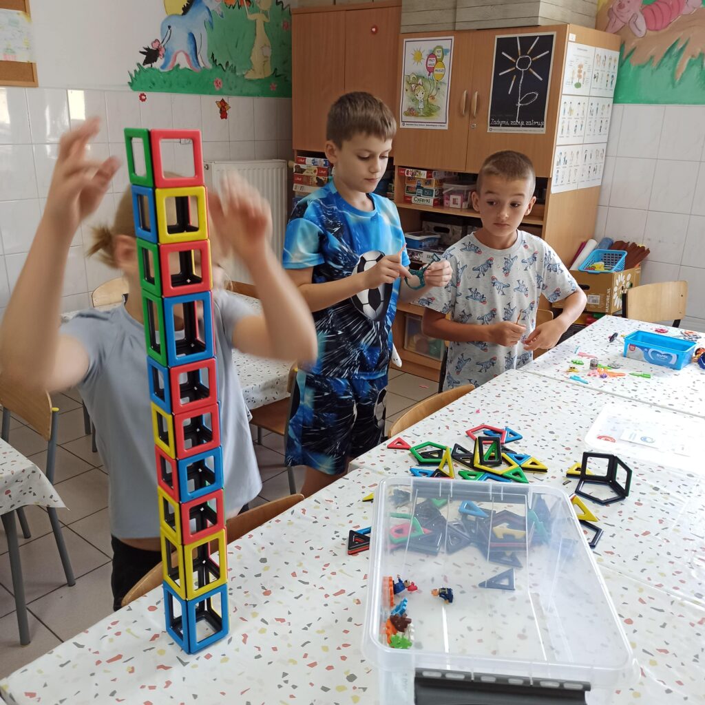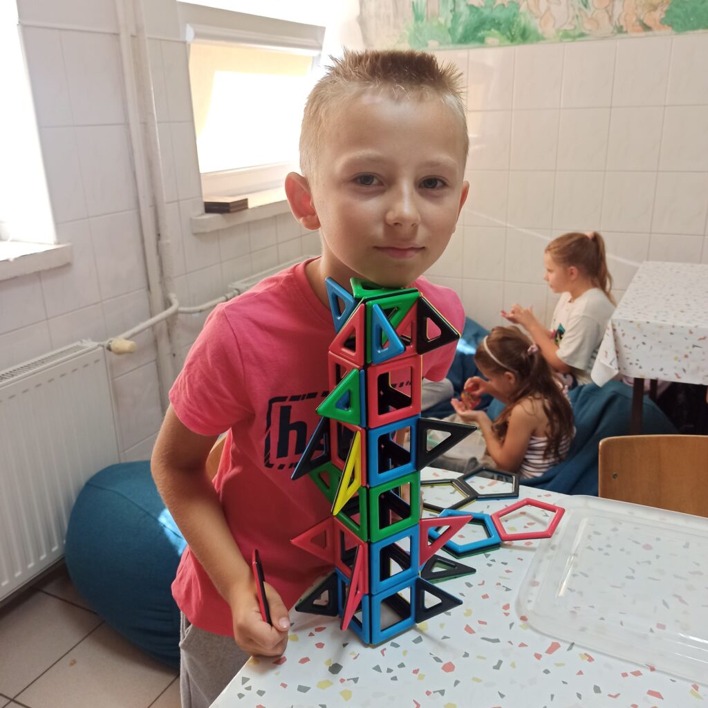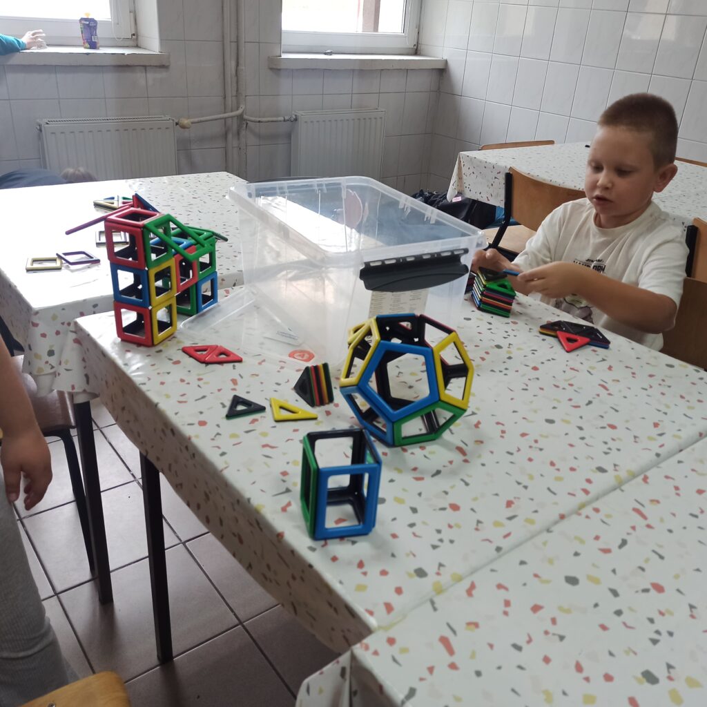 Uczniowie z przyjemnością tworzyli wszelkiego rodzaju budowle z klocków magnetycznych. Rozwijali kreatywność i twórcze myślenie tworząc: bunkry, wieżowce, sklepy, zagrody itp. Malując farbami z programu „Laboratoria Przyszłości” dzieci zaprezentowały swoje emocje. Powstały zabawne i interesujące stworki. Pomysły, wspólne rozwiązywanie problemów w trakcje budowli 3D integrowały grupę świetlicową.