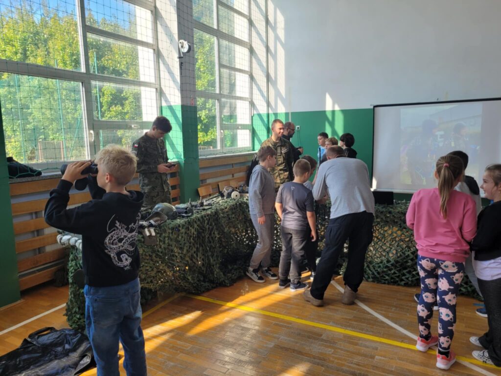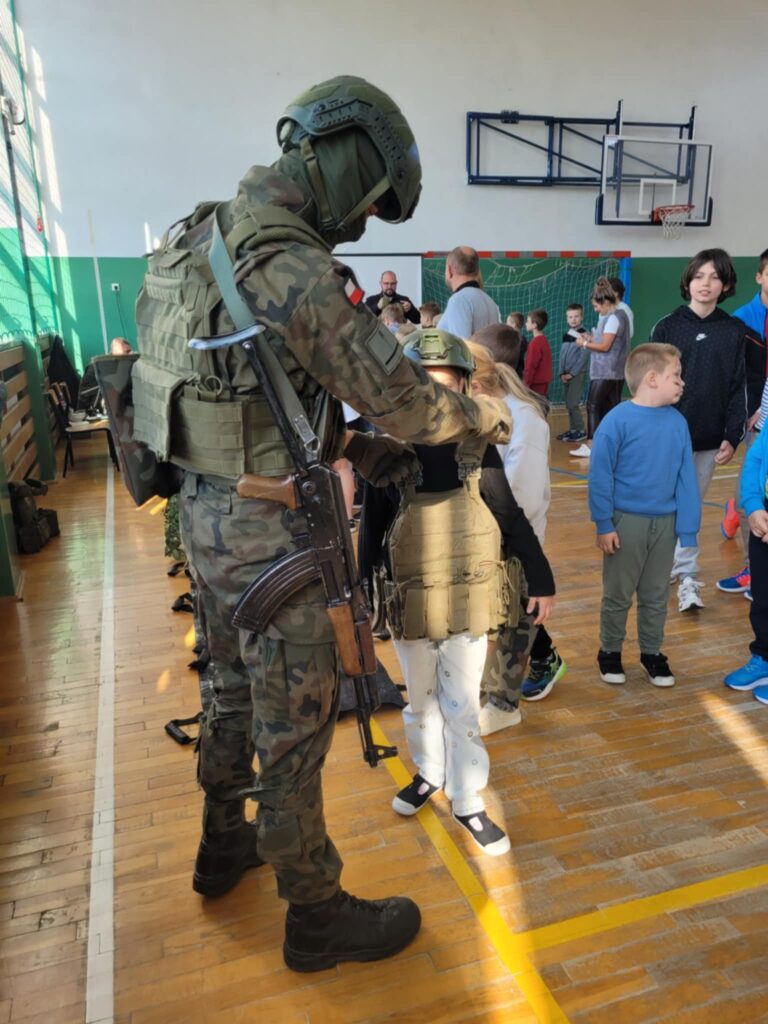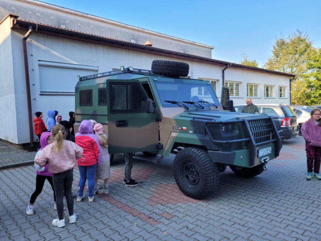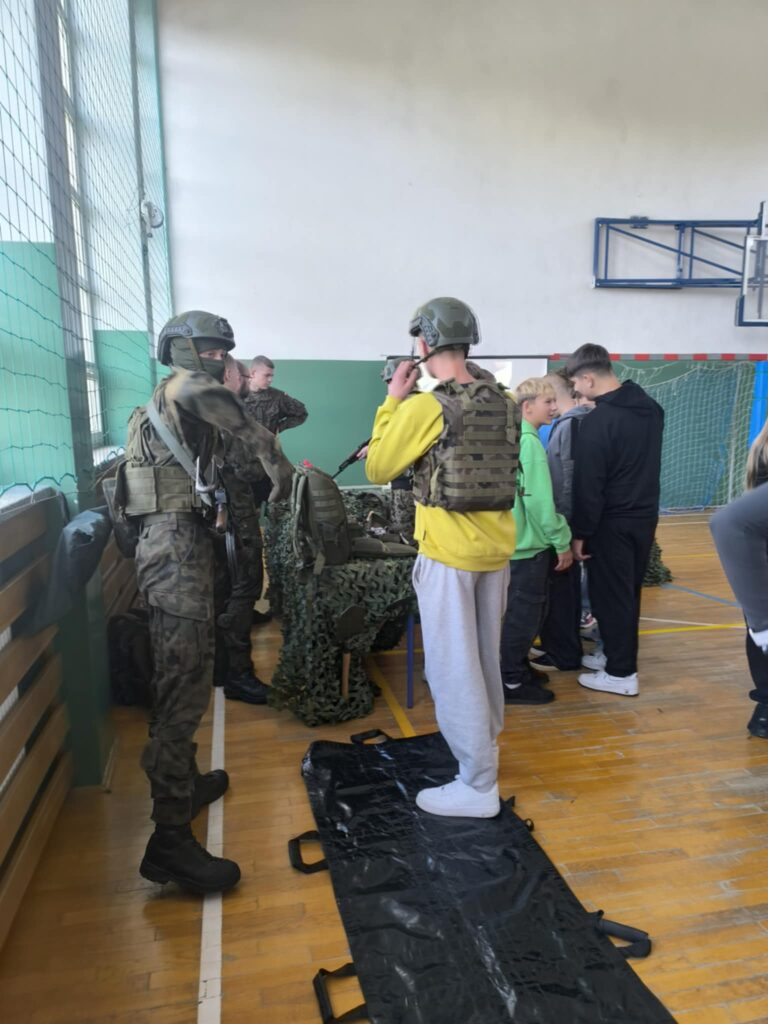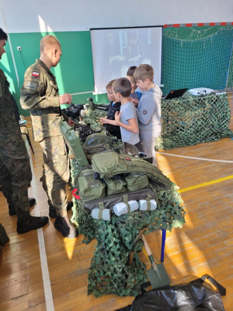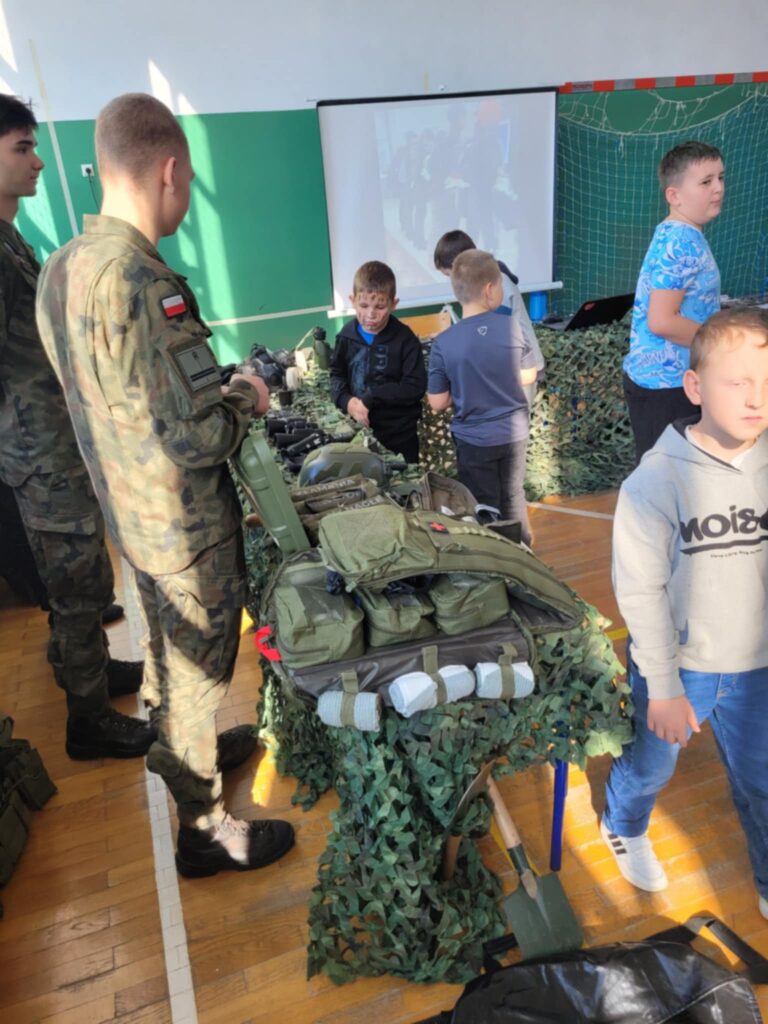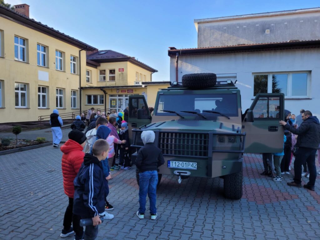 W czwartek, 02 października uczniowie Zespołu Placówek Oświatowych w Stykowie mieli okazję spotkać się z wyjątkowymi gośćmi. Z wizytą przybyli do nas żołnierze ze 103. Batalionu Lekkiej Piechoty 10. Świętokrzyskiej Brygady Obrony Terytorialnej w Ostrowcu Świętokrzyskim. Towarzyszyli im także uczniowie z Zakładu Doskonalenia Zawodowego z klas mundurowych w Starachowicach. W spotkaniu uczestniczyły nawet przedszkolaki. Celem tej wizyty było przede wszystkim przybliżenie uczniom codziennej, trudnej i niezwykle odpowiedzialnej służby, jaką pełnią polscy żołnierze dla ojczyzny. Wszyscy mieli okazję zapoznać się z rolą i zadaniami WOT w czasie pokoju, ale także w sytuacjach zagrożenia, poszerzyć wiedzę na temat bezpieczeństwa, obronności, numerów alarmowych czy udzielania pierwszej pomocy. Uczestnicy spotkania mogli także obejrzeć z bliska wojskowe mundury, hełmy, broń, plecaki, środki łączności. Przekaz słowny został wzbogacony o prezentacje multimedialne ukazujące działania żołnierzy w różnych sytuacjach, ćwiczenia wojskowe. Dużą atrakcją okazał się niewątpliwie zaparkowany przed wejściem do szkoły pojazd wojskowy. Samochód został udostępniony dzięki uprzejmości ze strony firmy Autobox Innovations w Starachowicach, która zajmuje się produkcją i modernizacją wyspecjalizowanych pojazdów wojskowych. Uczniowie mogli obejrzeć samochód na zewnątrz, wejść do jego środka, a nawet odbyć krótką przejażdżkę po szkolnym placu.