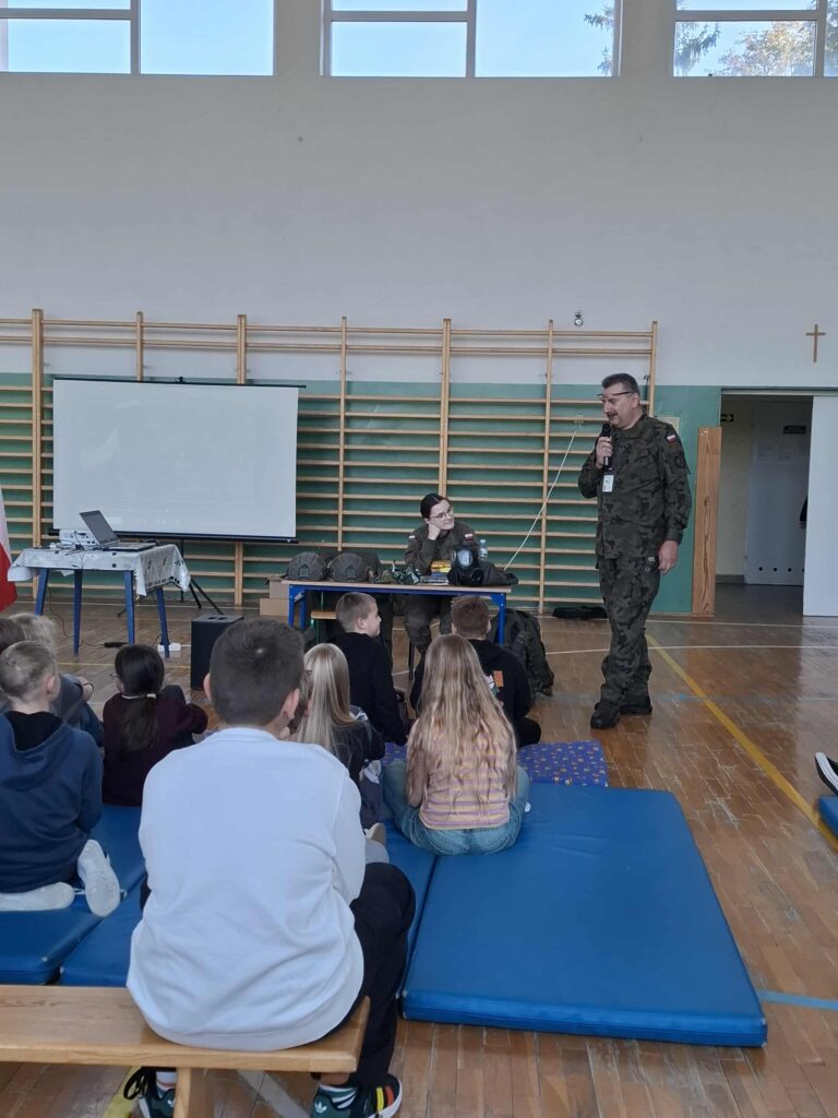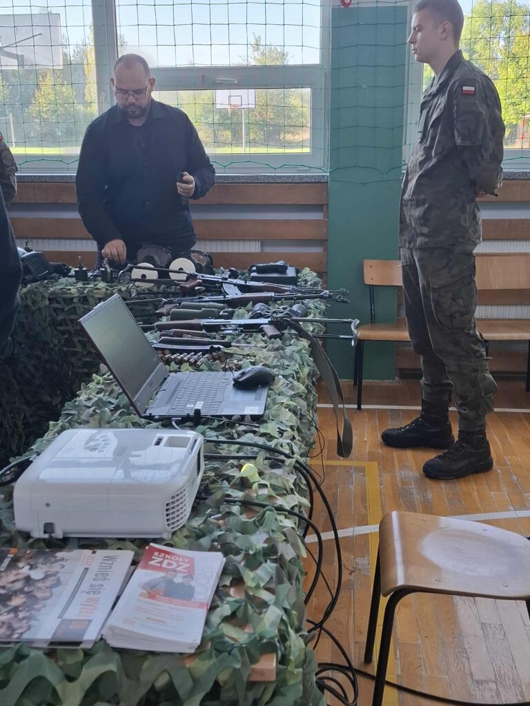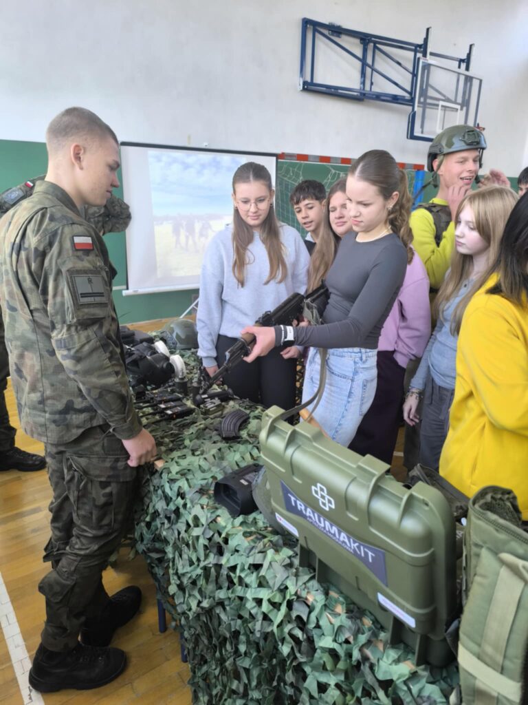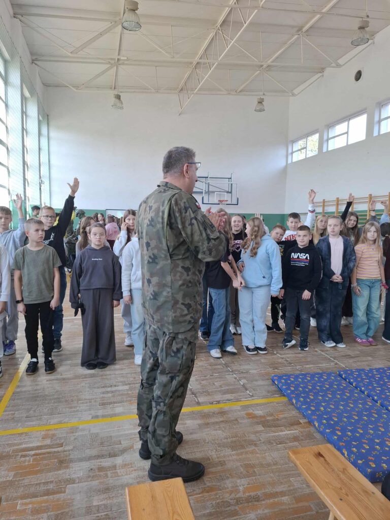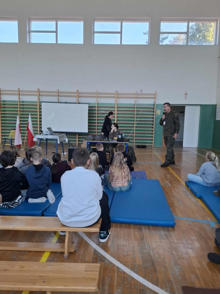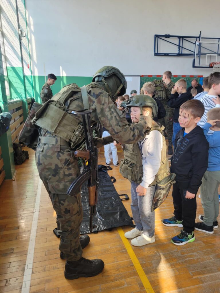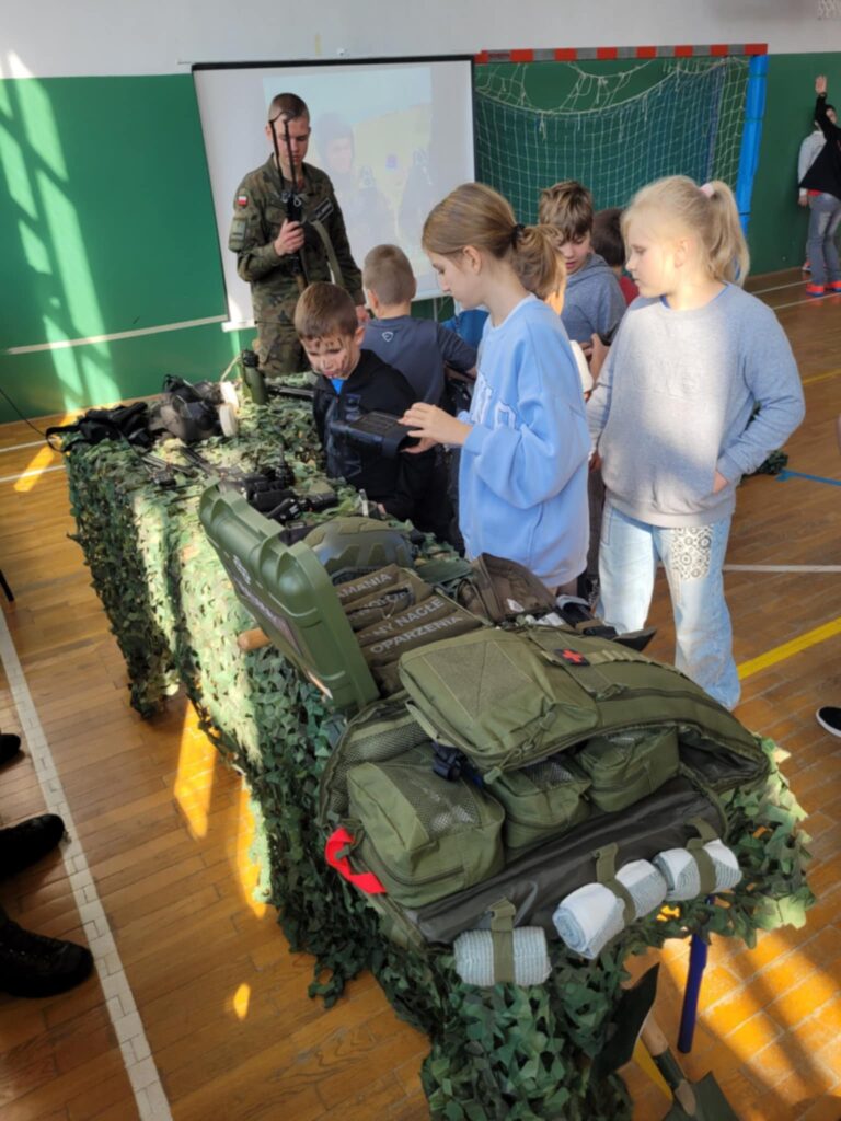 W czwartek, 02 października uczniowie Zespołu Placówek Oświatowych w Stykowie mieli okazję spotkać się z wyjątkowymi gośćmi. Z wizytą przybyli do nas żołnierze ze 103. Batalionu Lekkiej Piechoty 10. Świętokrzyskiej Brygady Obrony Terytorialnej w Ostrowcu Świętokrzyskim. Towarzyszyli im także uczniowie z Zakładu Doskonalenia Zawodowego z klas mundurowych w Starachowicach. W spotkaniu uczestniczyły nawet przedszkolaki. Celem tej wizyty było przede wszystkim przybliżenie uczniom codziennej, trudnej i niezwykle odpowiedzialnej służby, jaką pełnią polscy żołnierze dla ojczyzny. Wszyscy mieli okazję zapoznać się z rolą i zadaniami WOT w czasie pokoju, ale także w sytuacjach zagrożenia, poszerzyć wiedzę na temat bezpieczeństwa, obronności, numerów alarmowych czy udzielania pierwszej pomocy. Uczestnicy spotkania mogli także obejrzeć z bliska wojskowe mundury, hełmy, broń, plecaki, środki łączności. Przekaz słowny został wzbogacony o prezentacje multimedialne ukazujące działania żołnierzy w różnych sytuacjach, ćwiczenia wojskowe. Dużą atrakcją okazał się niewątpliwie zaparkowany przed wejściem do szkoły pojazd wojskowy. Samochód został udostępniony dzięki uprzejmości ze strony firmy Autobox Innovations w Starachowicach, która zajmuje się produkcją i modernizacją wyspecjalizowanych pojazdów wojskowych. Uczniowie mogli obejrzeć samochód na zewnątrz, wejść do jego środka, a nawet odbyć krótką przejażdżkę po szkolnym placu.