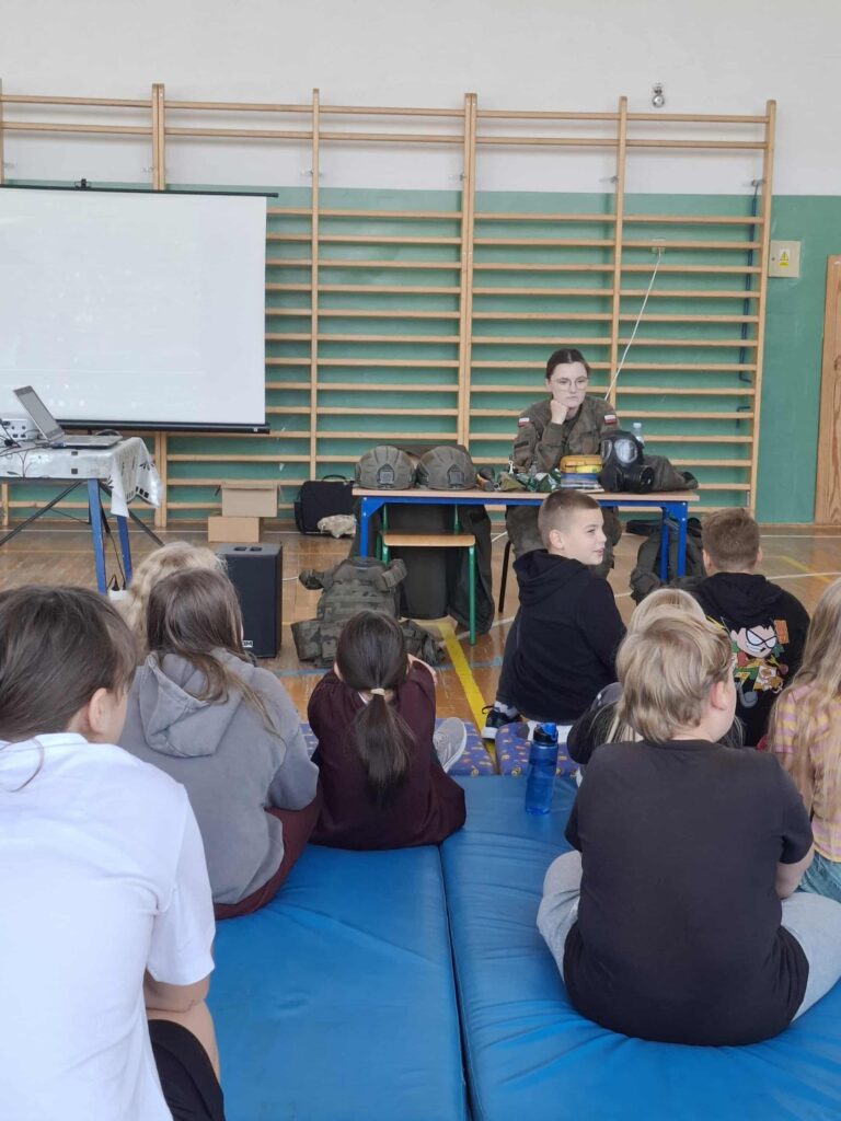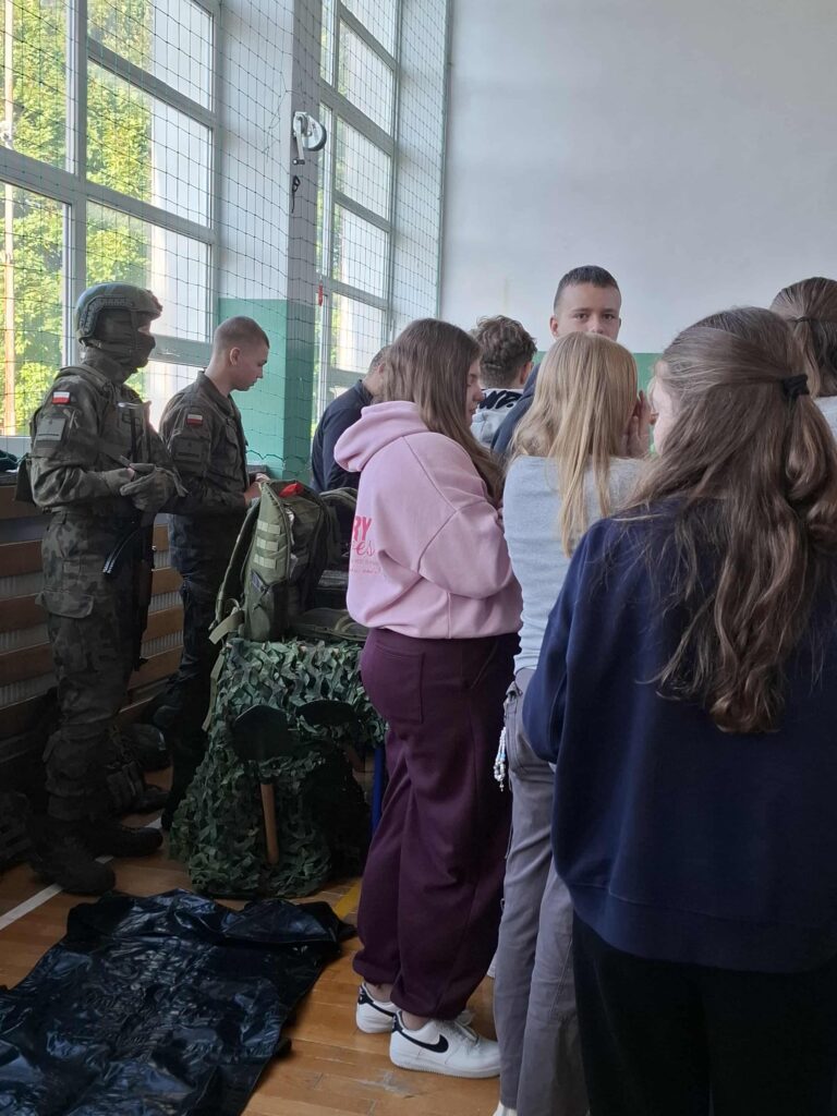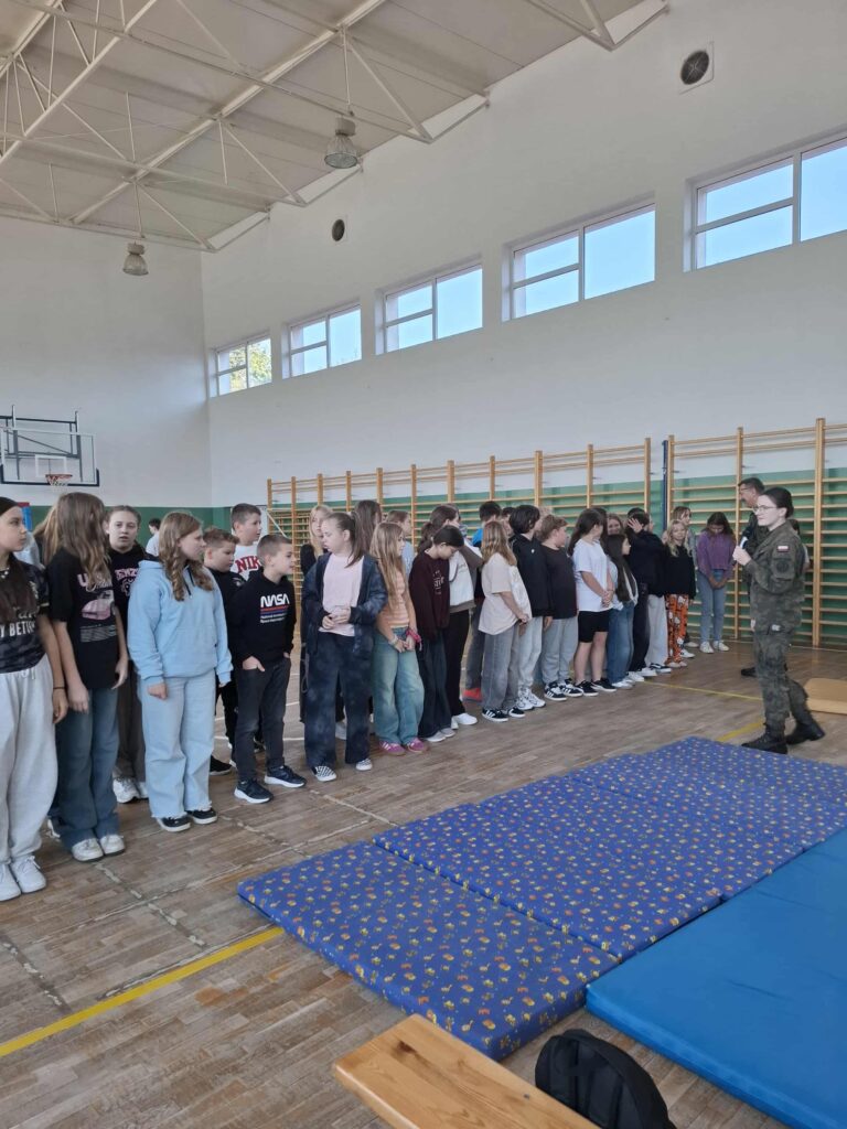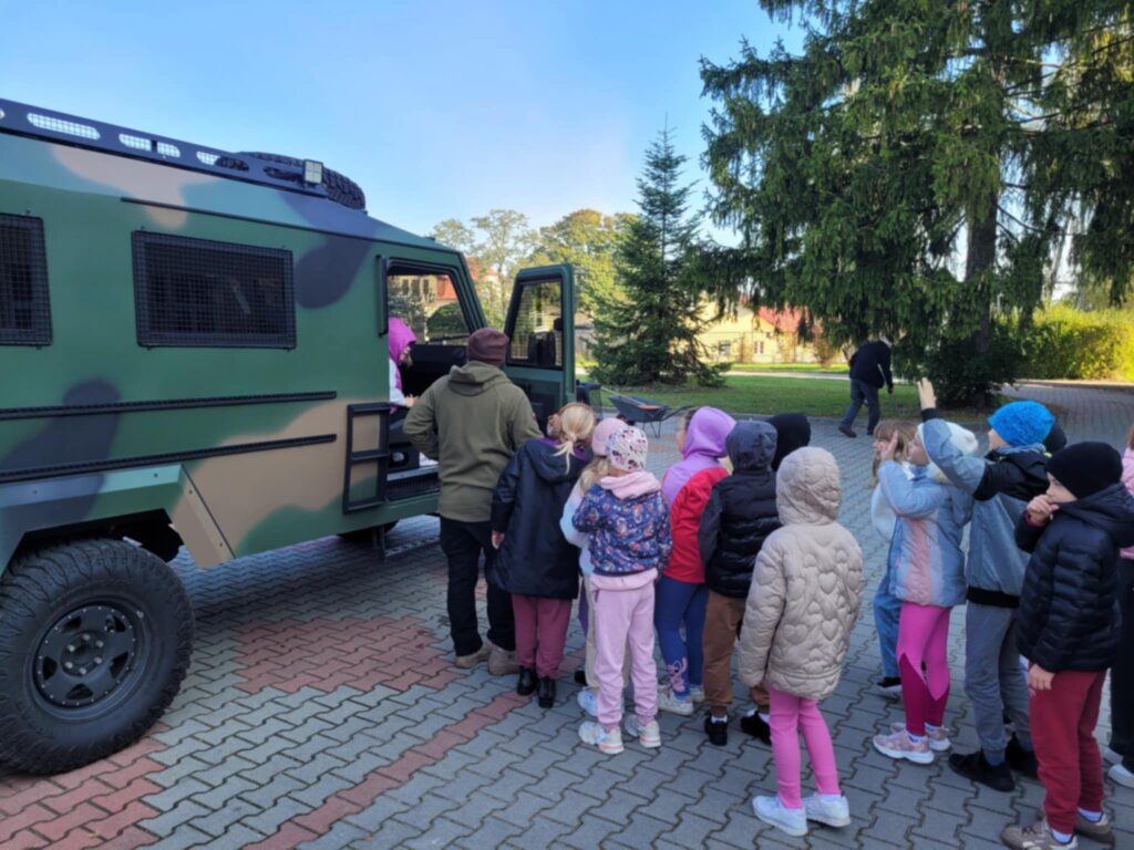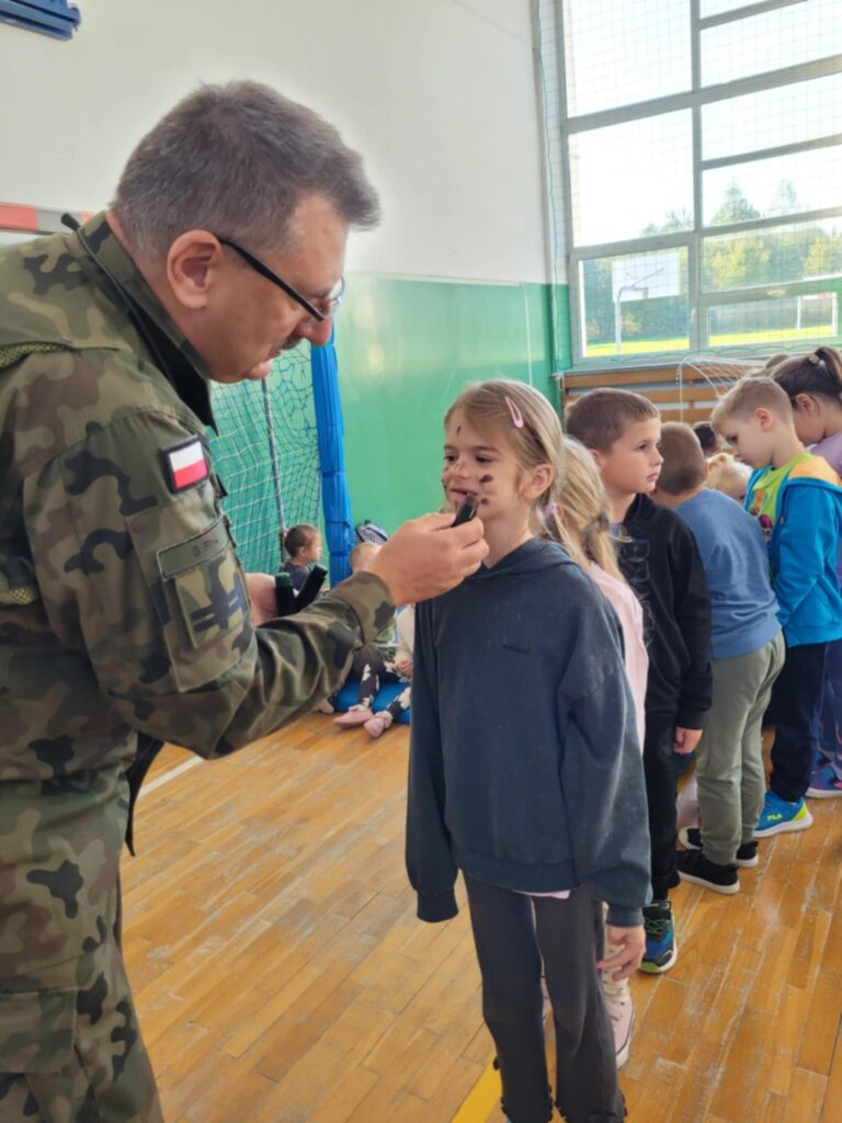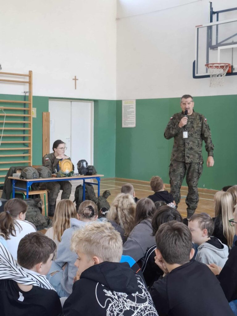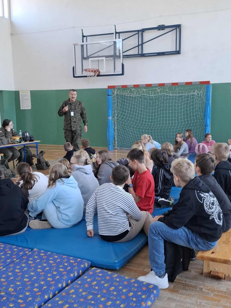 W czwartek, 02 października uczniowie Zespołu Placówek Oświatowych w Stykowie mieli okazję spotkać się z wyjątkowymi gośćmi. Z wizytą przybyli do nas żołnierze ze 103. Batalionu Lekkiej Piechoty 10. Świętokrzyskiej Brygady Obrony Terytorialnej w Ostrowcu Świętokrzyskim. Towarzyszyli im także uczniowie z Zakładu Doskonalenia Zawodowego z klas mundurowych w Starachowicach. W spotkaniu uczestniczyły nawet przedszkolaki. Celem tej wizyty było przede wszystkim przybliżenie uczniom codziennej, trudnej i niezwykle odpowiedzialnej służby, jaką pełnią polscy żołnierze dla ojczyzny. Wszyscy mieli okazję zapoznać się z rolą i zadaniami WOT w czasie pokoju, ale także w sytuacjach zagrożenia, poszerzyć wiedzę na temat bezpieczeństwa, obronności, numerów alarmowych czy udzielania pierwszej pomocy. Uczestnicy spotkania mogli także obejrzeć z bliska wojskowe mundury, hełmy, broń, plecaki, środki łączności. Przekaz słowny został wzbogacony o prezentacje multimedialne ukazujące działania żołnierzy w różnych sytuacjach, ćwiczenia wojskowe. Dużą atrakcją okazał się niewątpliwie zaparkowany przed wejściem do szkoły pojazd wojskowy. Samochód został udostępniony dzięki uprzejmości ze strony firmy Autobox Innovations w Starachowicach, która zajmuje się produkcją i modernizacją wyspecjalizowanych pojazdów wojskowych. Uczniowie mogli obejrzeć samochód na zewnątrz, wejść do jego środka, a nawet odbyć krótką przejażdżkę po szkolnym placu.