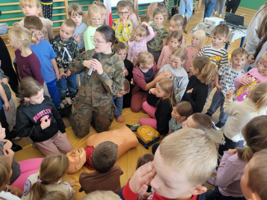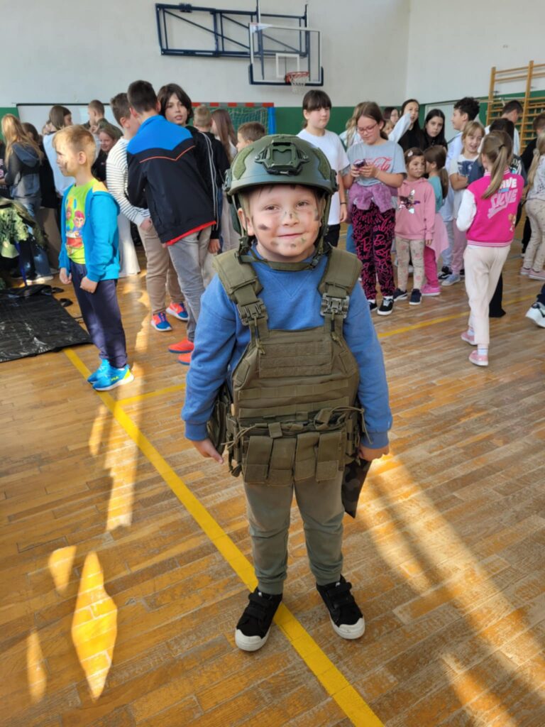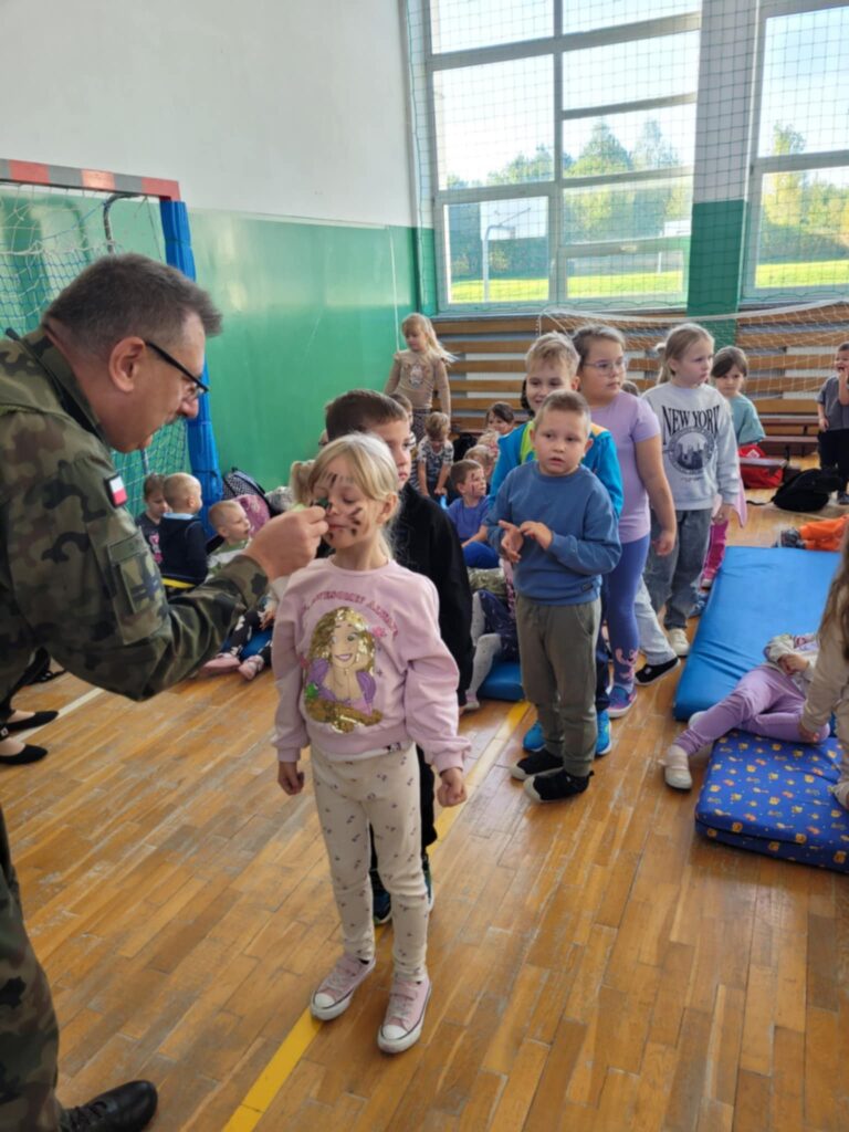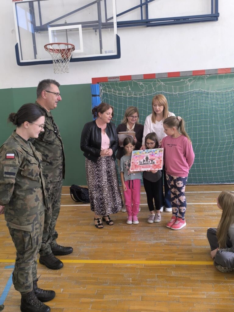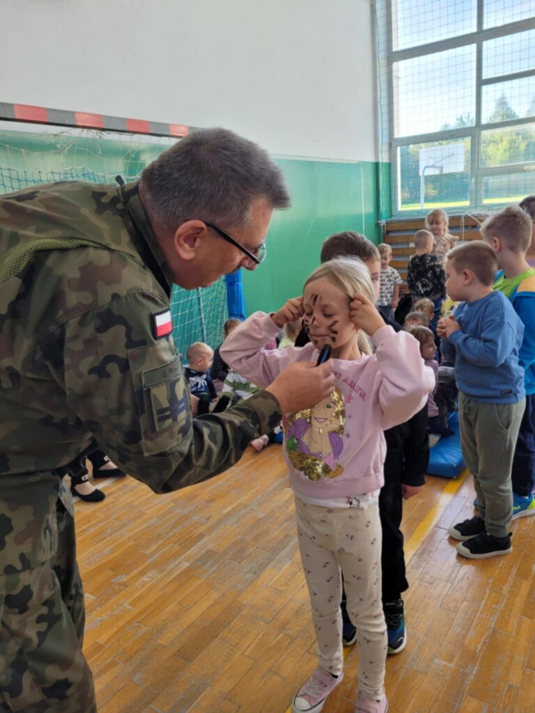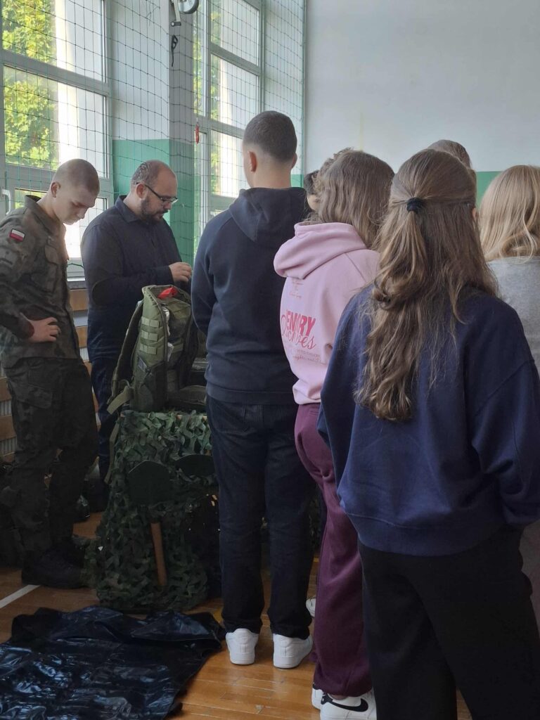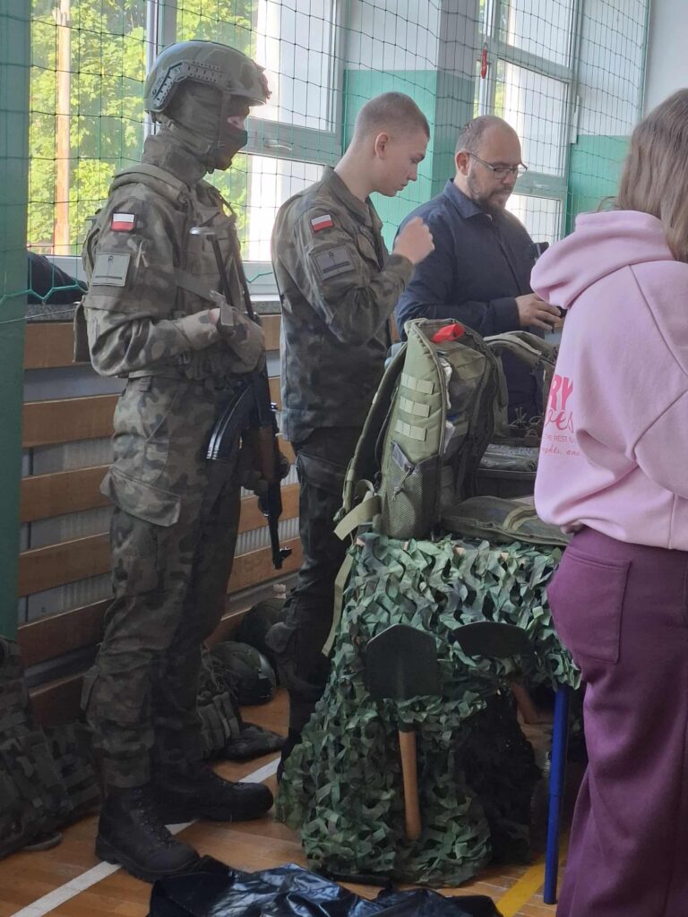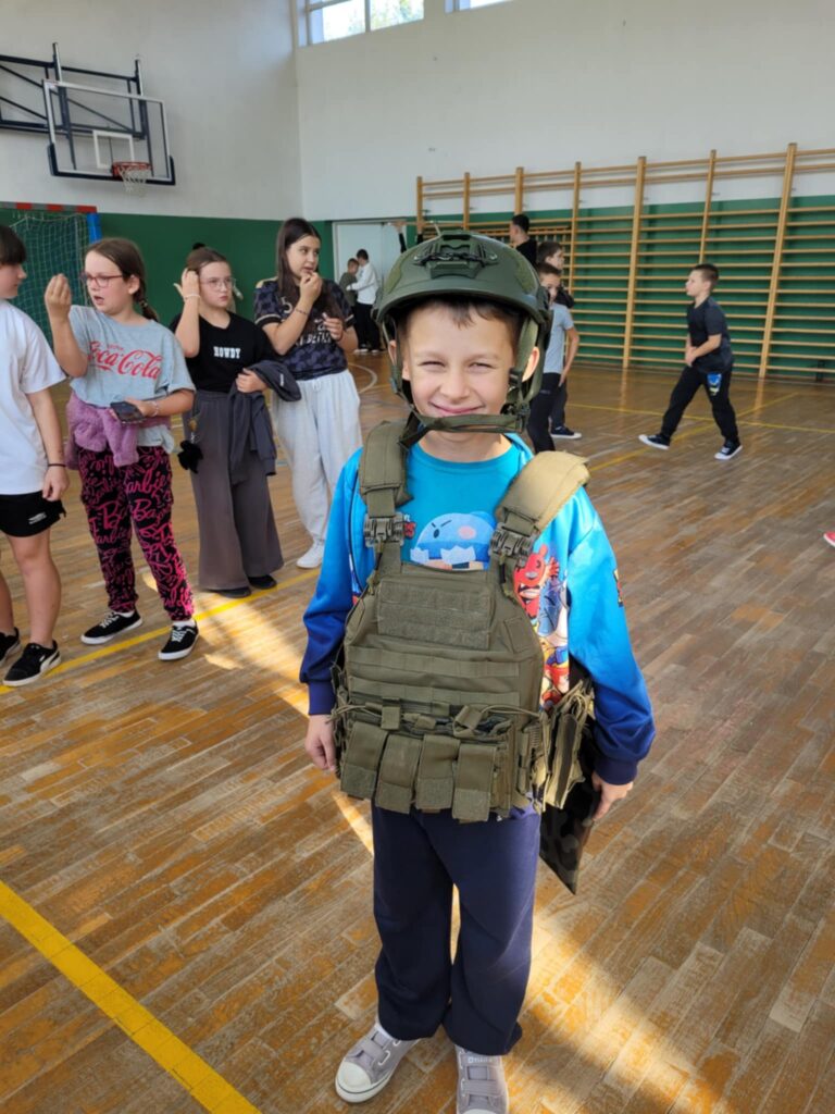 W czwartek, 02 października uczniowie Zespołu Placówek Oświatowych w Stykowie mieli okazję spotkać się z wyjątkowymi gośćmi. Z wizytą przybyli do nas żołnierze ze 103. Batalionu Lekkiej Piechoty 10. Świętokrzyskiej Brygady Obrony Terytorialnej w Ostrowcu Świętokrzyskim. Towarzyszyli im także uczniowie z Zakładu Doskonalenia Zawodowego z klas mundurowych w Starachowicach. W spotkaniu uczestniczyły nawet przedszkolaki. Celem tej wizyty było przede wszystkim przybliżenie uczniom codziennej, trudnej i niezwykle odpowiedzialnej służby, jaką pełnią polscy żołnierze dla ojczyzny. Wszyscy mieli okazję zapoznać się z rolą i zadaniami WOT w czasie pokoju, ale także w sytuacjach zagrożenia, poszerzyć wiedzę na temat bezpieczeństwa, obronności, numerów alarmowych czy udzielania pierwszej pomocy. Uczestnicy spotkania mogli także obejrzeć z bliska wojskowe mundury, hełmy, broń, plecaki, środki łączności. Przekaz słowny został wzbogacony o prezentacje multimedialne ukazujące działania żołnierzy w różnych sytuacjach, ćwiczenia wojskowe. Dużą atrakcją okazał się niewątpliwie zaparkowany przed wejściem do szkoły pojazd wojskowy. Samochód został udostępniony dzięki uprzejmości ze strony firmy Autobox Innovations w Starachowicach, która zajmuje się produkcją i modernizacją wyspecjalizowanych pojazdów wojskowych. Uczniowie mogli obejrzeć samochód na zewnątrz, wejść do jego środka, a nawet odbyć krótką przejażdżkę po szkolnym placu.