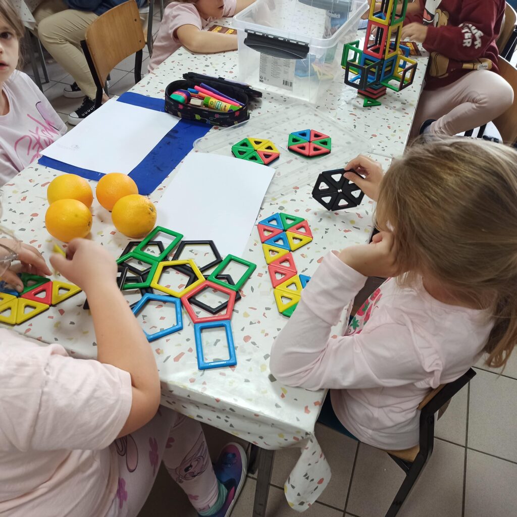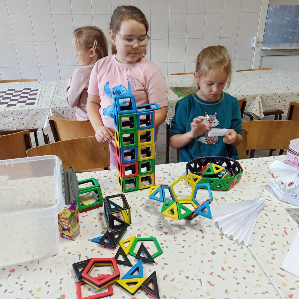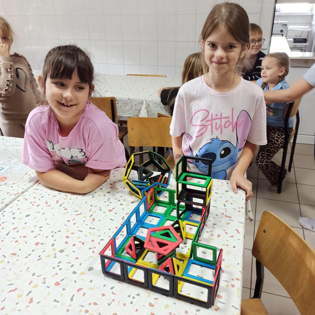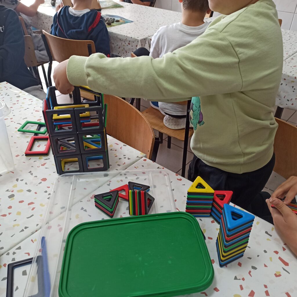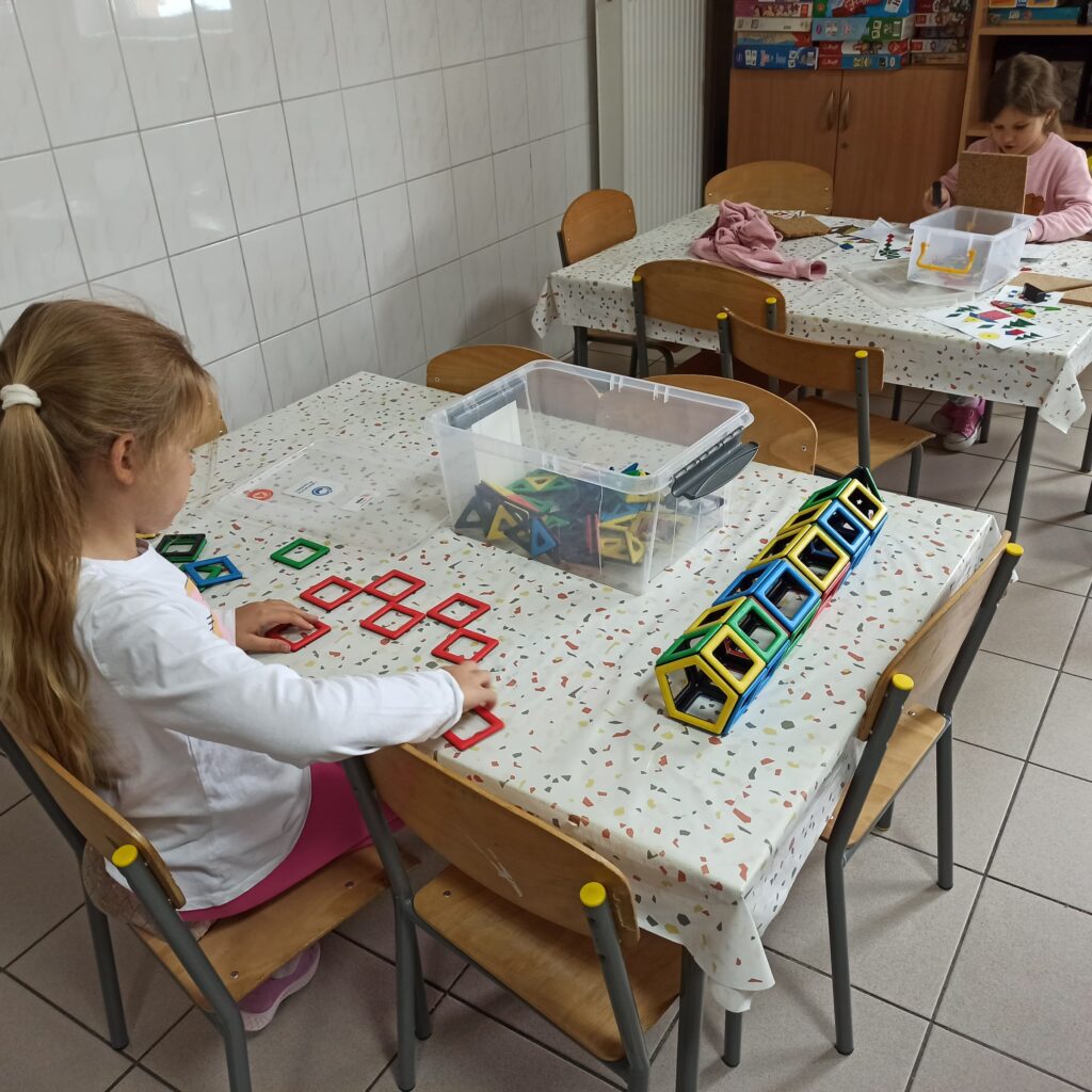 Zabawy konstrukcyjne uprawniają motorykę małą i dużą. Uczniowie używają cklocków magnetycznych stawali się coraz bardziej kreatywni w sowich działaniach. Łączyli zabawy tematyczne z zabawami konstrukcyjnymi: sklep, apteka, bank. Rozwijali przy tym motorykę małą i dużą, a integracja w grupie przyniosła efekty J