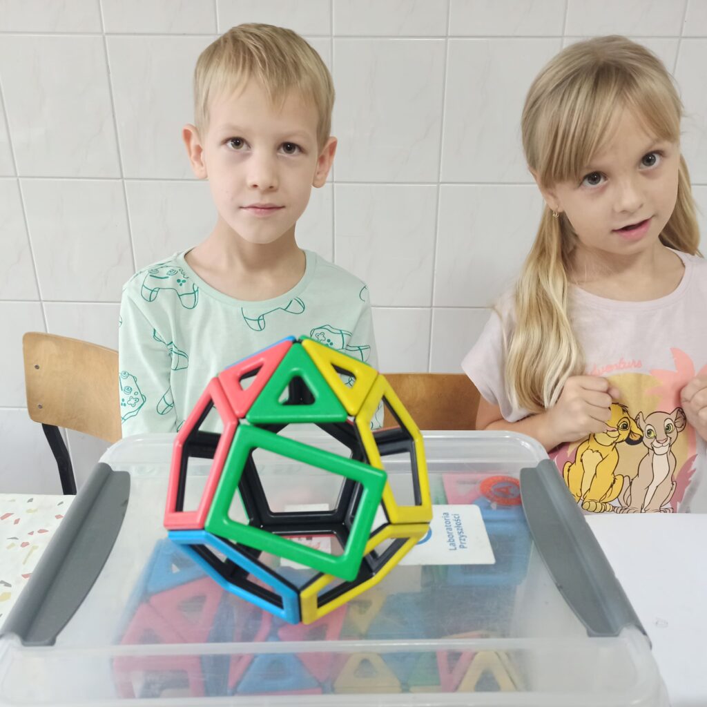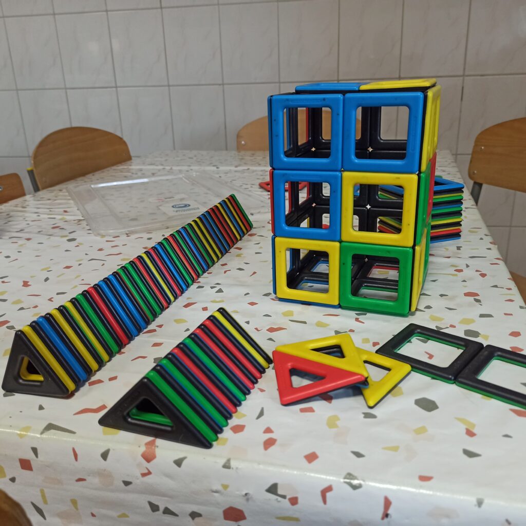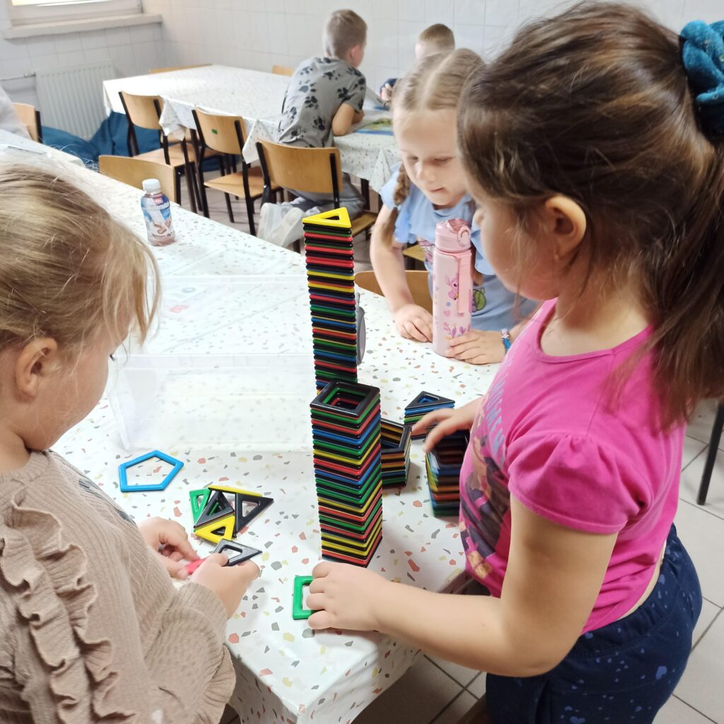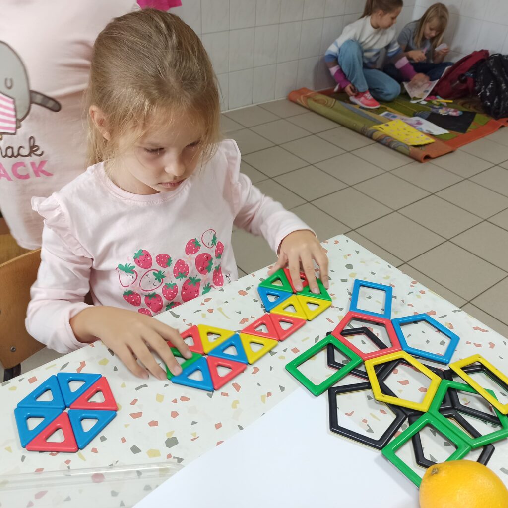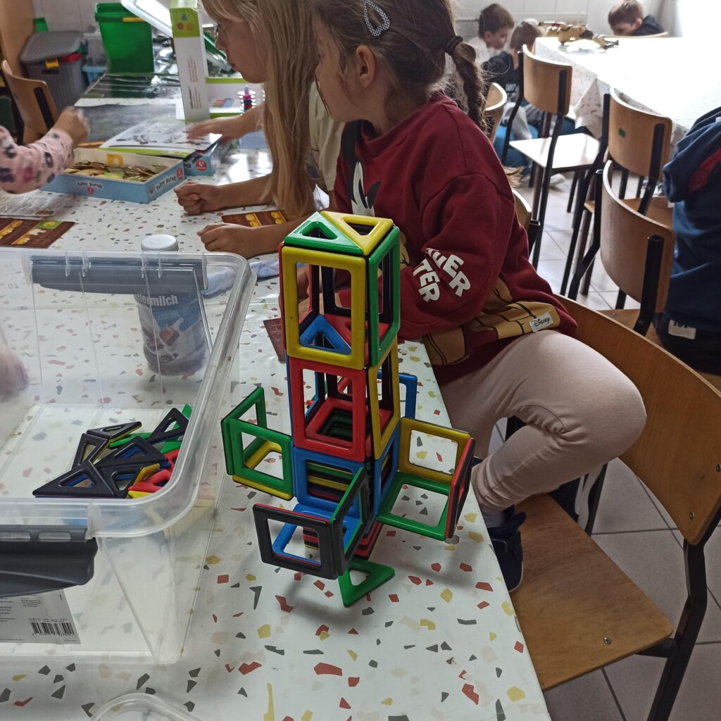 Zabawy konstrukcyjne uprawniają motorykę małą i dużą. Uczniowie używają cklocków magnetycznych stawali się coraz bardziej kreatywni w sowich działaniach. Łączyli zabawy tematyczne z zabawami konstrukcyjnymi: sklep, apteka, bank. Rozwijali przy tym motorykę małą i dużą, a integracja w grupie przyniosła efekty J