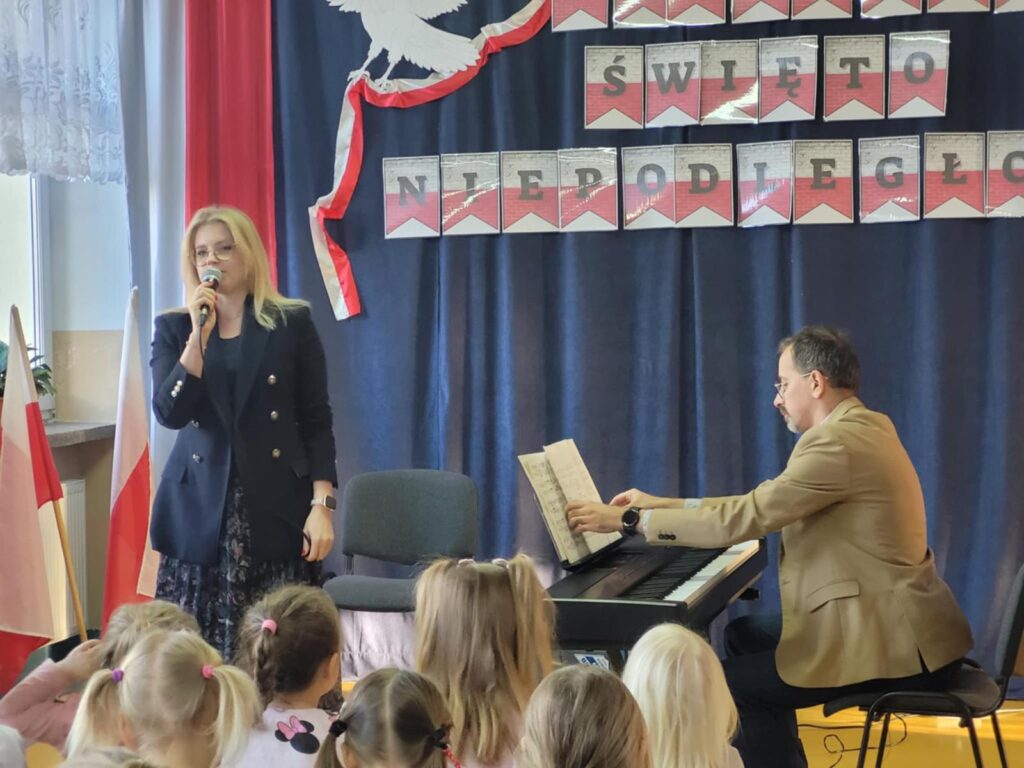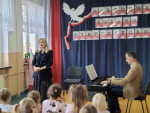 Prowadząca audycję muzyczną, pani Aleksandra Deryng- Jaroń, nie tylko pełniła rolę prelegenta, ale także zachwyciła publiczność szkolną wykonaniem pieśni Stanisława Moniuszki, m.in. ,,Kum i kuma”.