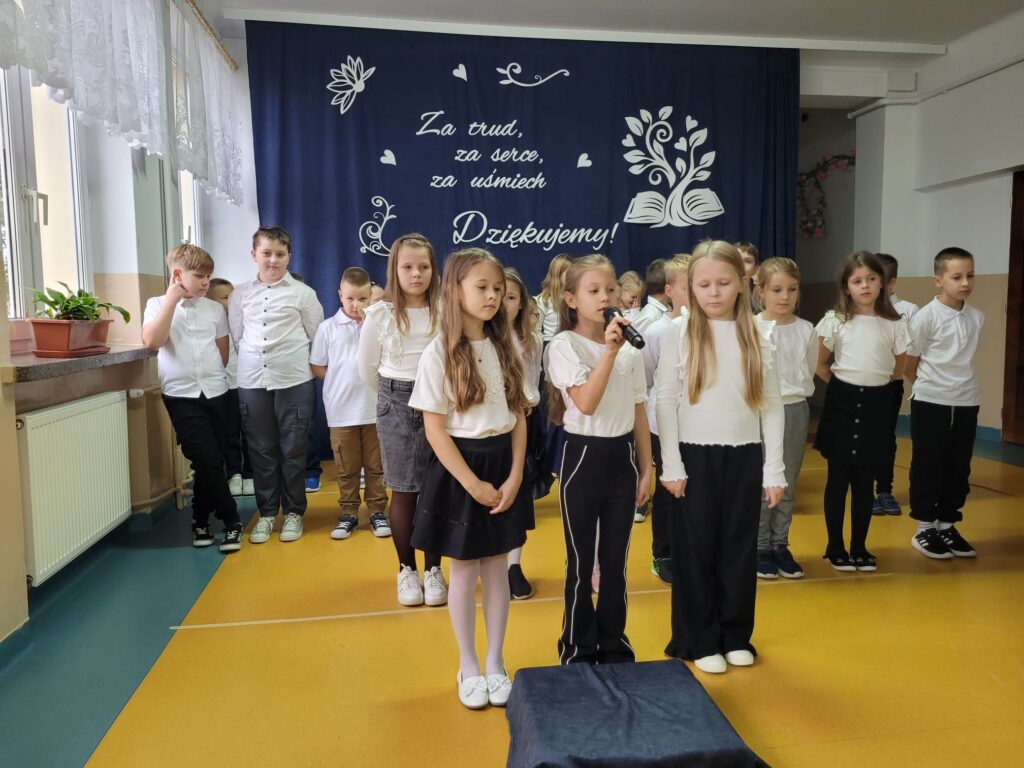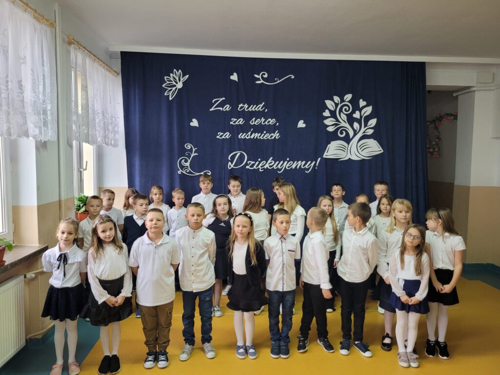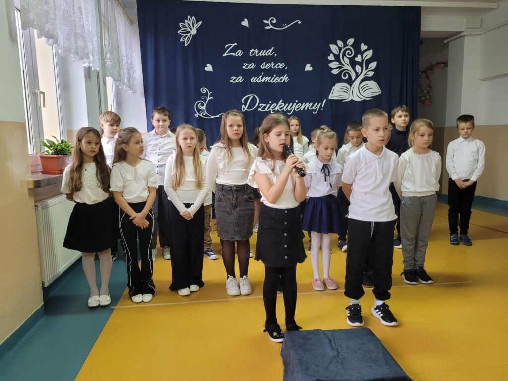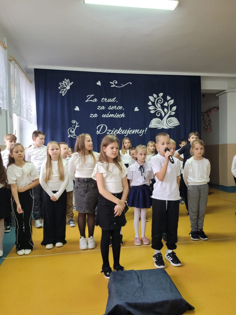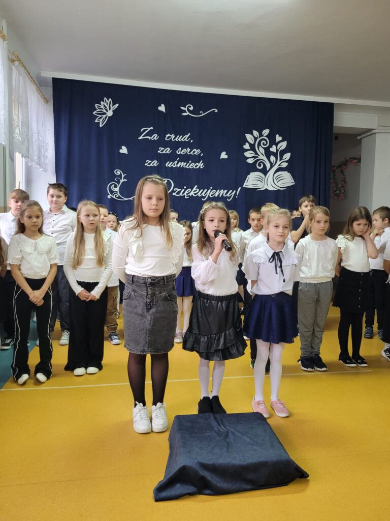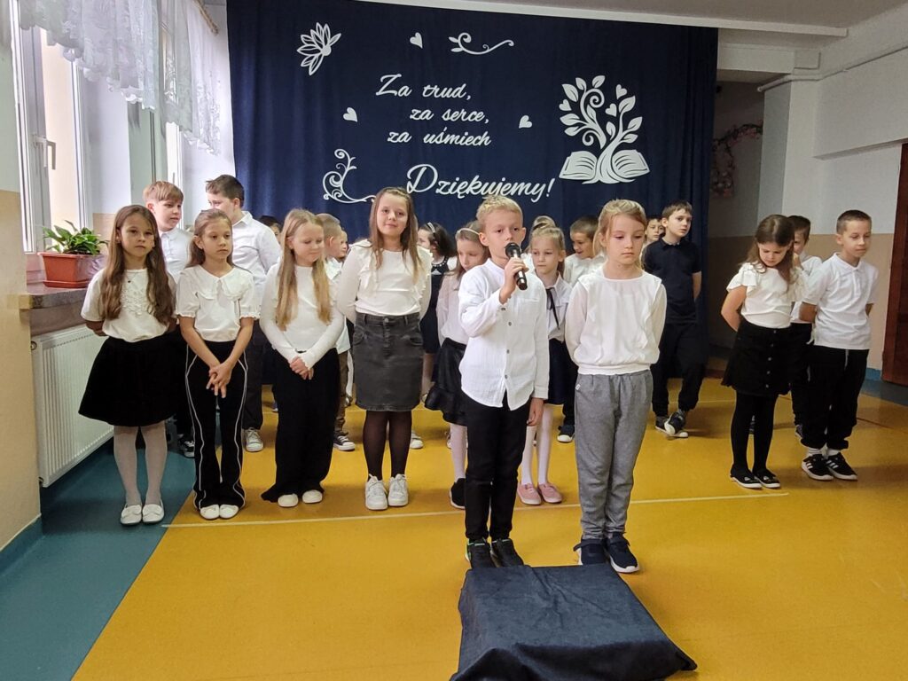 Wystąpili uczniowie klas II i III, którzy przez wiele dni z zaangażowaniem ćwiczyli swoje role, uczyli się wierszyków i piosenek, aby w piękny sposób podziękować nauczycielom oraz wszystkim pracownikom szkoły. Mali artyści zaprezentowali wzruszające przedstawienie, które zostało nagrodzone gromkimi brawami. Na zakończenie występu uczniowie wręczyli wszystkim obecnym czerwone róże – symbol wdzięczności i szacunku.