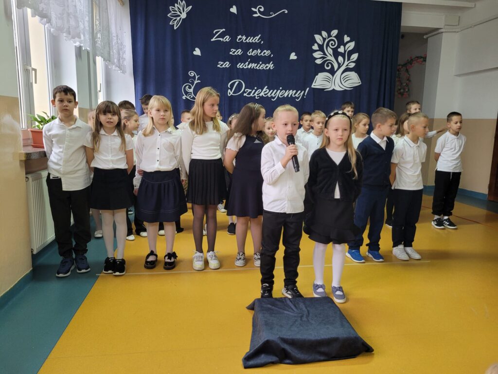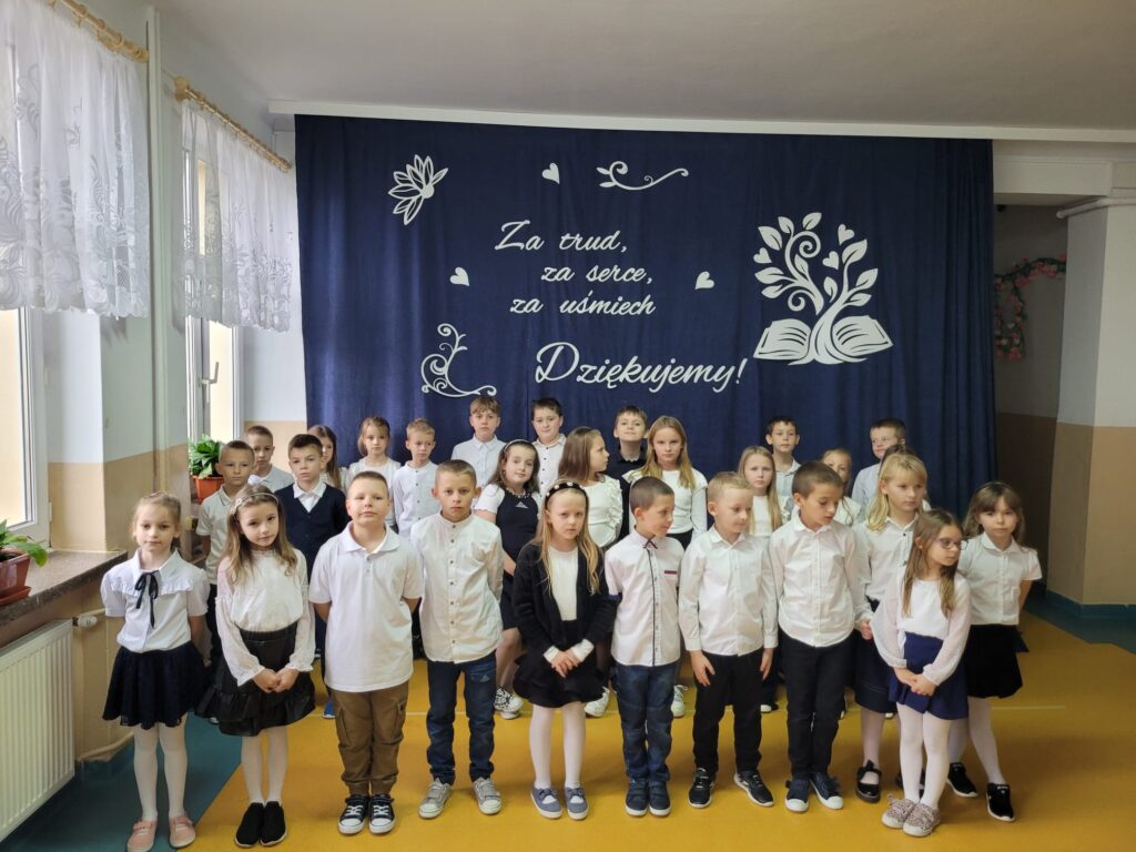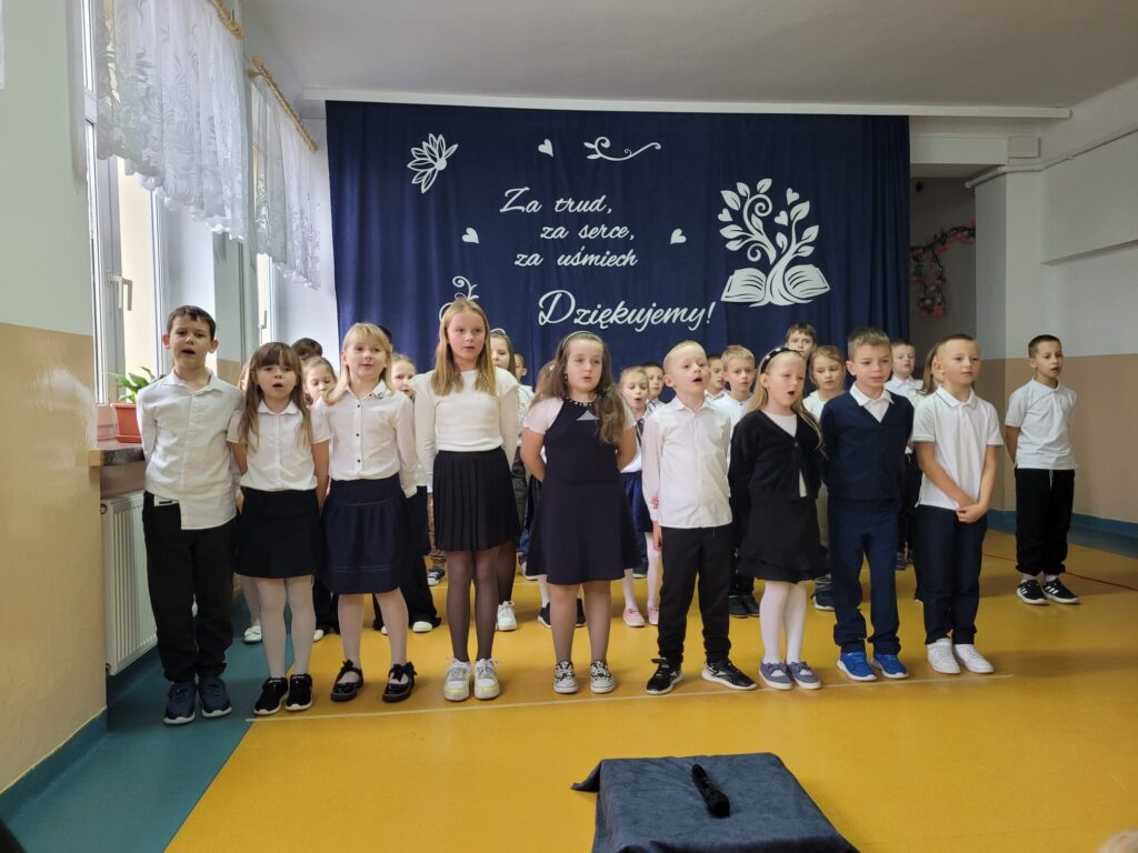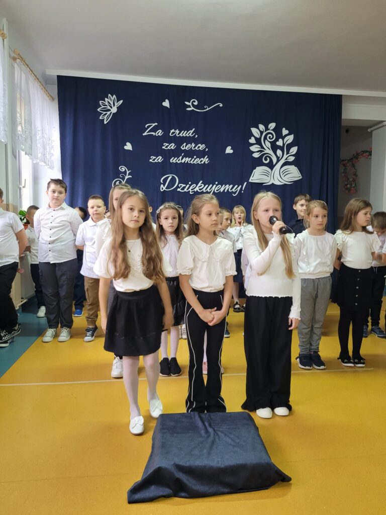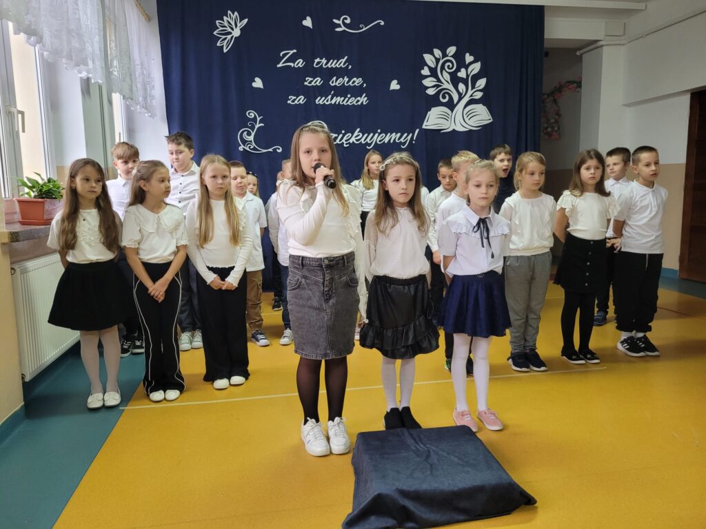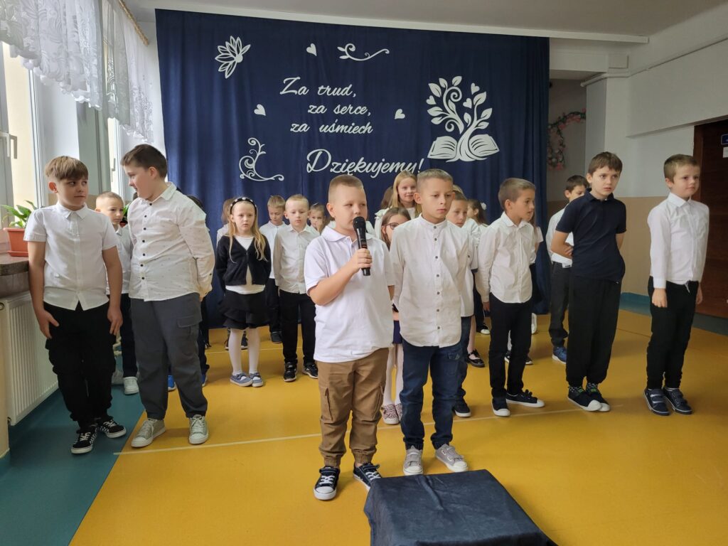 Wystąpili uczniowie klas II i III, którzy przez wiele dni z zaangażowaniem ćwiczyli swoje role, uczyli się wierszyków i piosenek, aby w piękny sposób podziękować nauczycielom oraz wszystkim pracownikom szkoły. Mali artyści zaprezentowali wzruszające przedstawienie, które zostało nagrodzone gromkimi brawami. Na zakończenie występu uczniowie wręczyli wszystkim obecnym czerwone róże – symbol wdzięczności i szacunku.