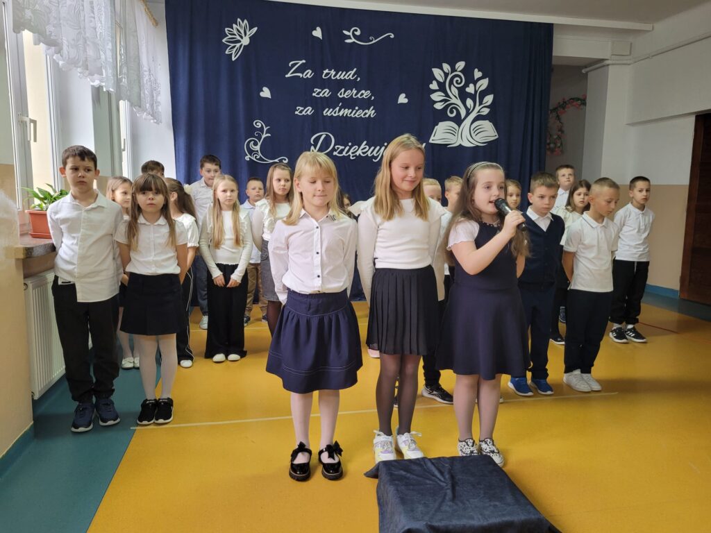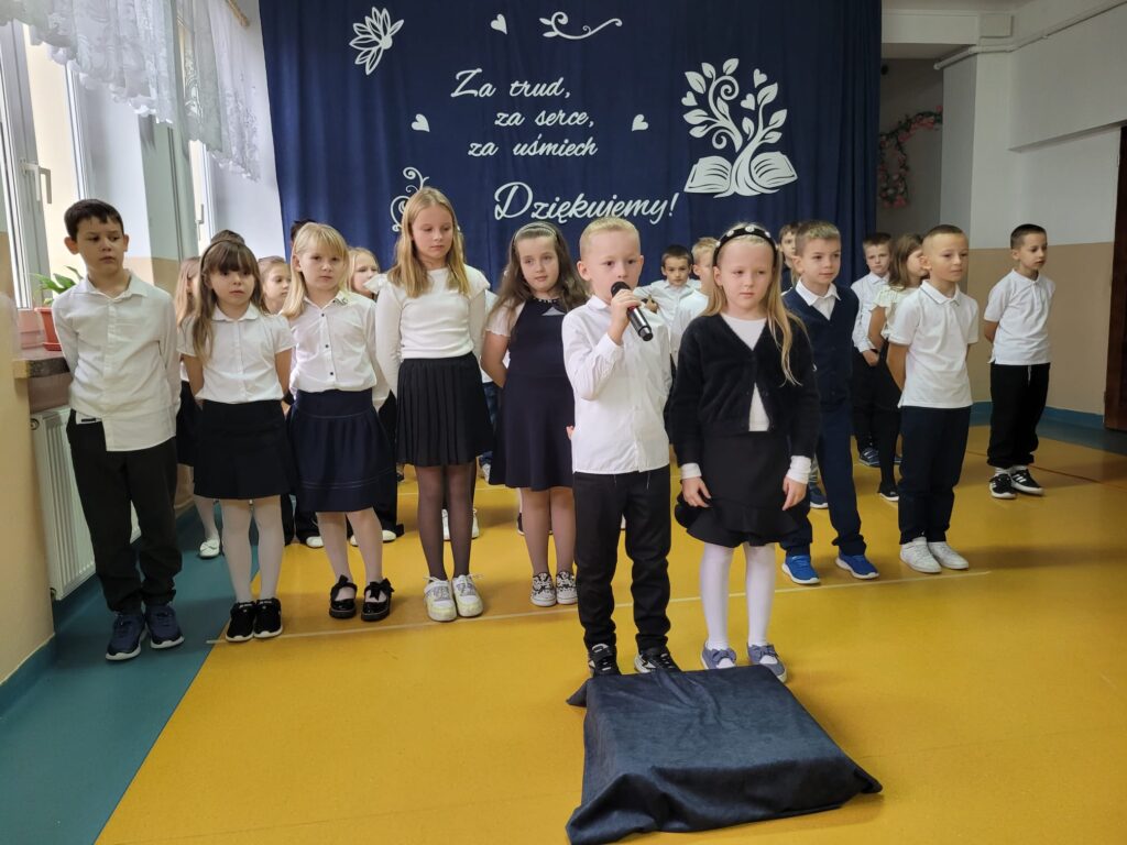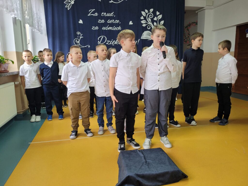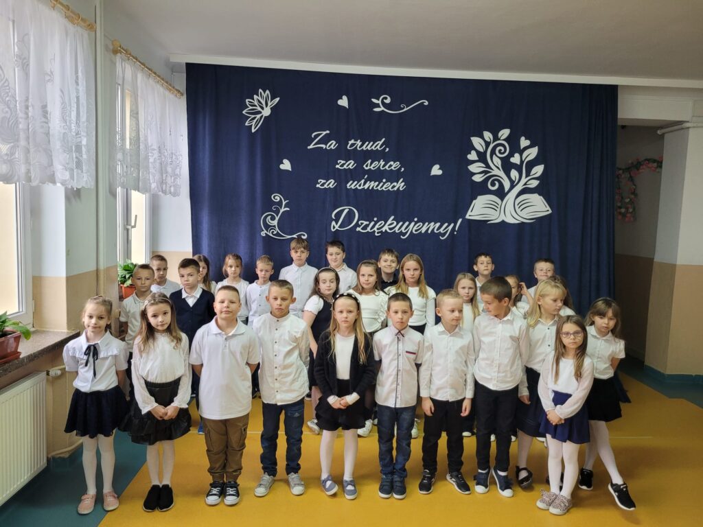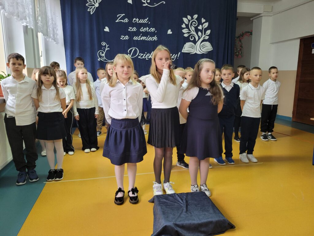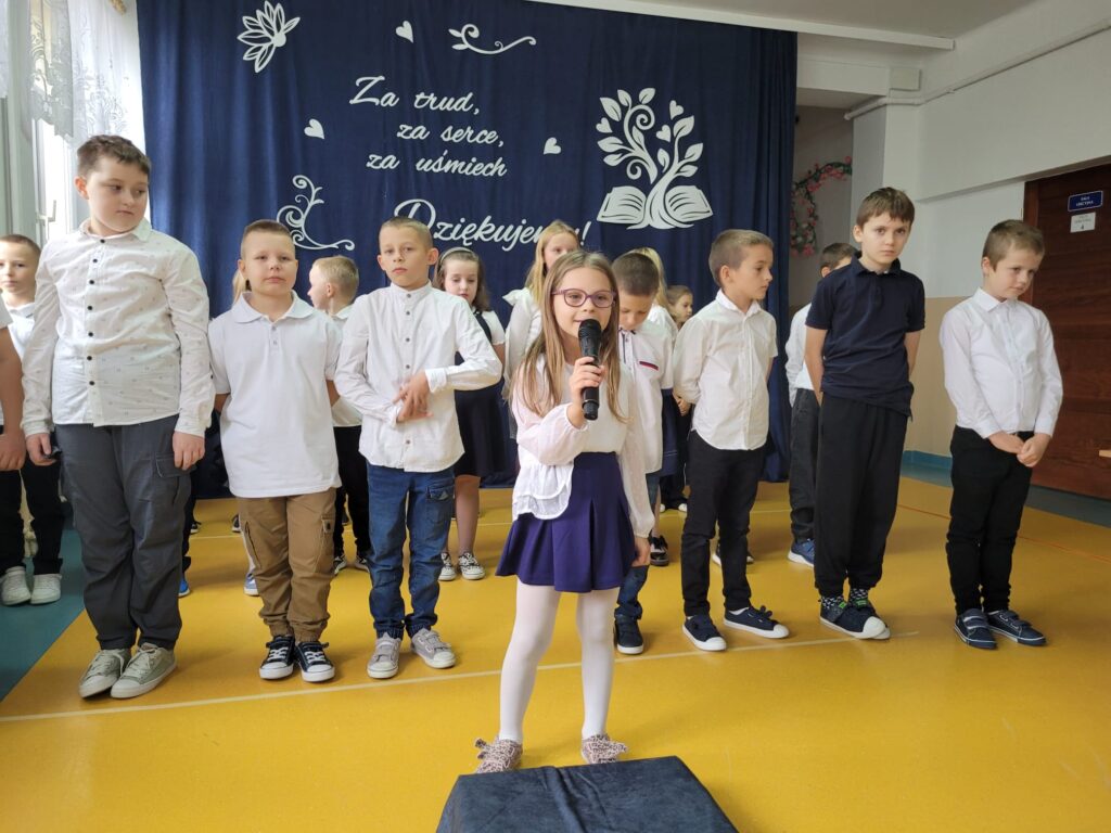 Wystąpili uczniowie klas II i III, którzy przez wiele dni z zaangażowaniem ćwiczyli swoje role, uczyli się wierszyków i piosenek, aby w piękny sposób podziękować nauczycielom oraz wszystkim pracownikom szkoły. Mali artyści zaprezentowali wzruszające przedstawienie, które zostało nagrodzone gromkimi brawami. Na zakończenie występu uczniowie wręczyli wszystkim obecnym czerwone róże – symbol wdzięczności i szacunku.