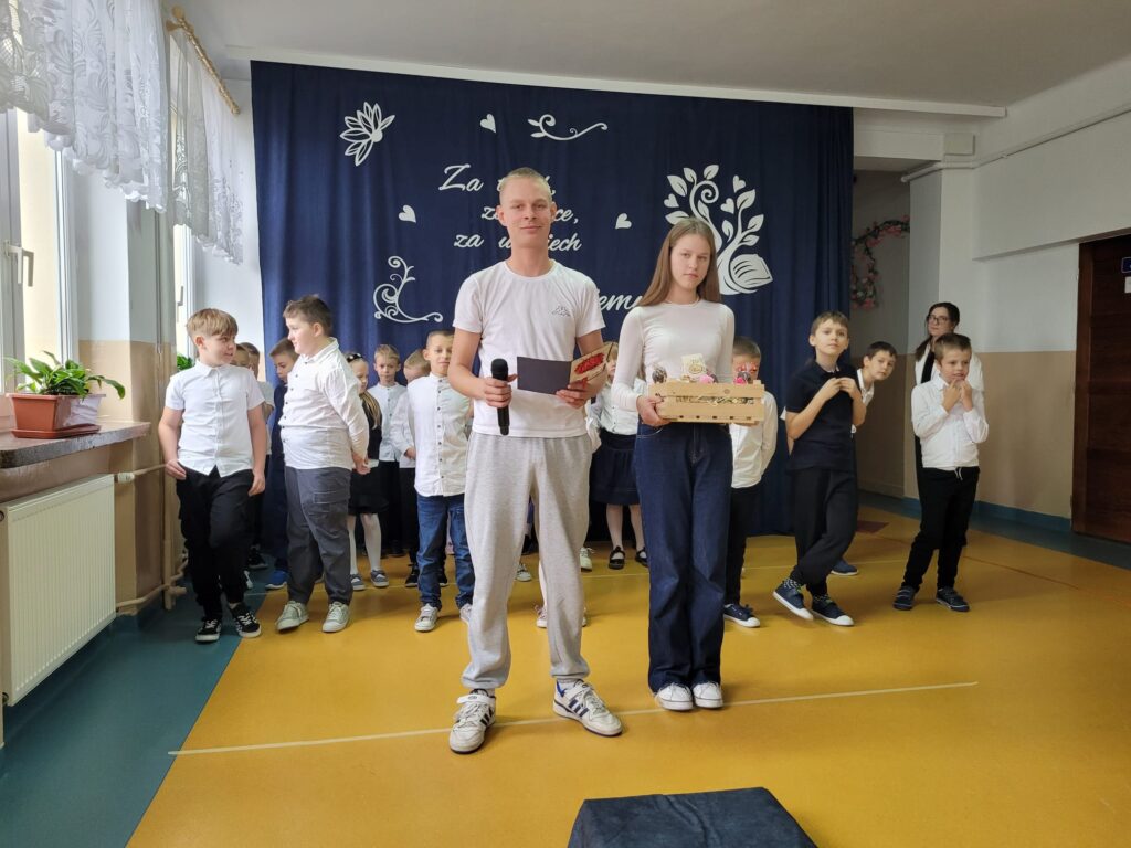 Następnie przedstawiciele Samorządu Uczniowskiego – Julian z klasy VIII oraz Julia z klasy VII, złożyli życzenia i podziękowania w imieniu uczniów.