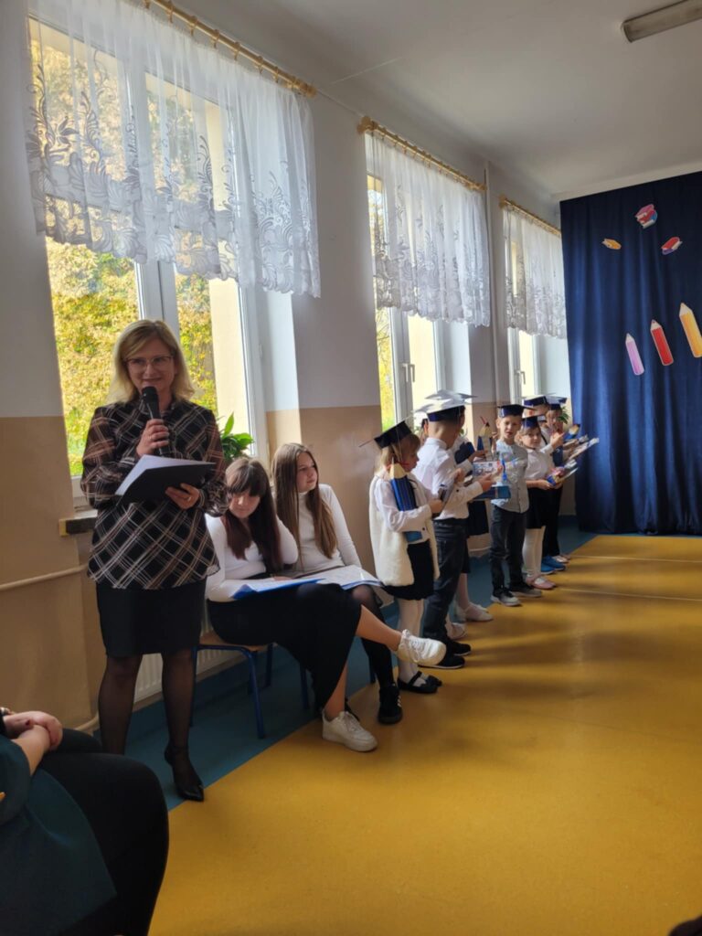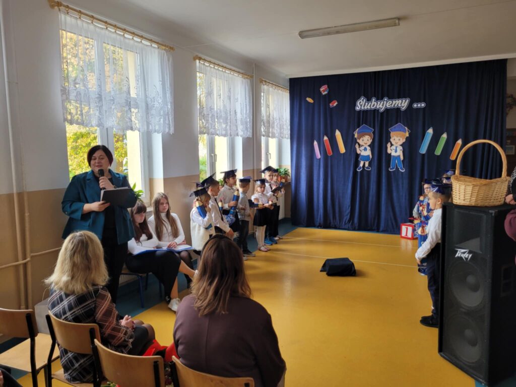 22 października w naszej szkole odbyła się uroczystość Pasowania na Ucznia klasy pierwszej. To ważne i wyjątkowe wydarzenie w życiu każdego dziecka, symbolicznie rozpoczynające nowy etap edukacji szkolnej. Uroczystość rozpoczęły uczennice klasy szóstej, które powitały Panią Martę Turek – pełniącą obowiązki Dyrektora Centrum Usług Wspólnych, Panią Dyrektor Krystynę Kasicę, nauczycieli, rodziców oraz pierwszoklasistów. Następnie uczniowie klasy I zaprezentowali część artystyczną przygotowaną pod kierunkiem wychowawczyni Eweliny Kalinowskiej. Dzieci z ogromnym zaangażowaniem recytowały wiersze i śpiewały piosenki, wykazując się odwagą i radością z występu. Ich prezentacja została nagrodzona gromkimi brawami.