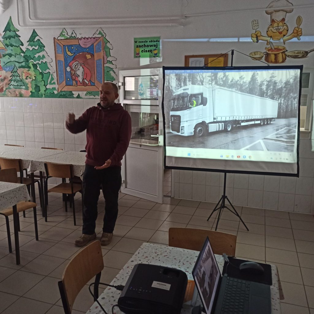 Na spotkaniu uczniowie dowiedzieli się, że zawód kierowca nie należy do najłatwiejszych. Kierowcy samochodu ciężarowego mają za zadanie bezpiecznie przewozić towar na krajowych i międzynarodowych trasach, co obejmuje nie tylko prowadzenie pojazdu, ale także załadunek/rozładunek, dbałość o stan techniczny ciężarówki, wypełnianie dokumentacji, kontrolę czasu pracy oraz często kilku- lub kilkunastodniowe wyjazdy, wymagające samodzielności. Kierowca jest odpowiedzialny za terminowe i bezpieczne dostarczenie ładunku, przestrzeganie przepisów ruchu drogowego i utrzymanie pojazdu w dobrej kondycji, często wykonując drobne naprawy i obsługując odprawy celne. Podsumowując dobrego kierowcę cechuje doświadczenie i umiejętność szybkiej reakcji w niespodziewanych sytuacjach.