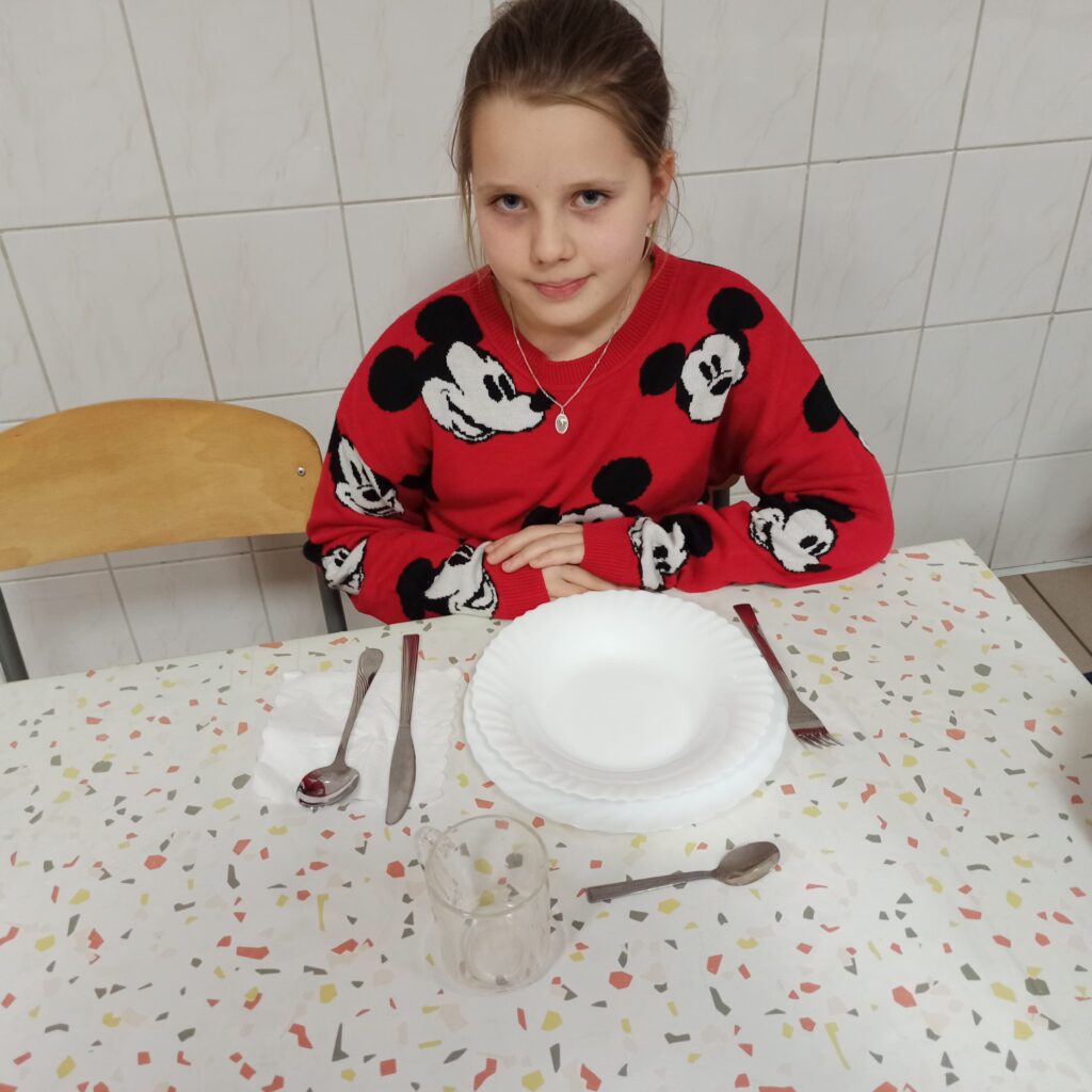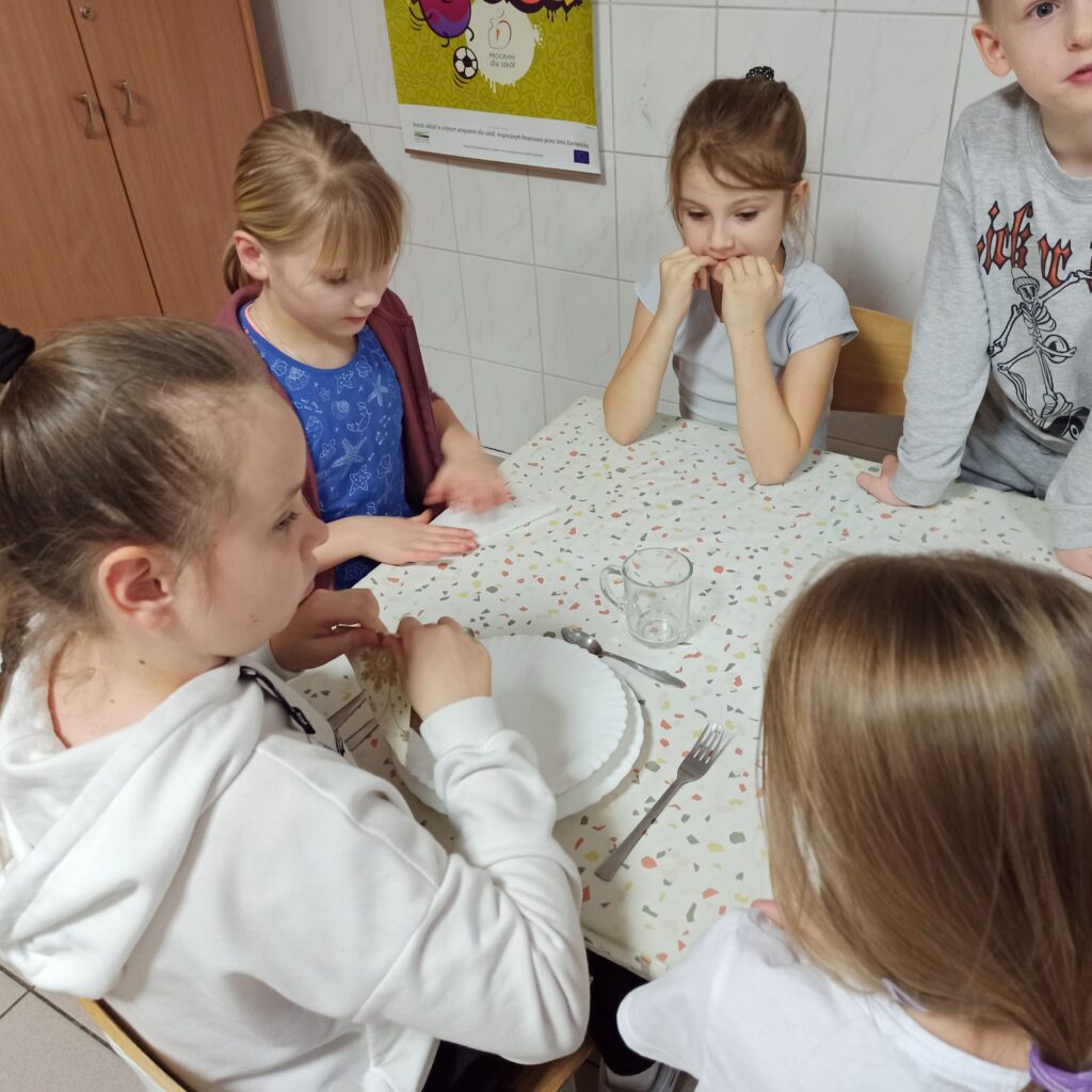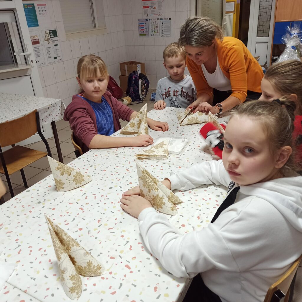 W dalszej części spotkania uczniowie uczyli się układać poprawnie talerze, szklanki oraz sztućce na stole. W ćwiczeniach praktycznych dzieci zostały podzielone na 3 grupy, w każdej wiekowo mieszane. Nauka najlepiej wychodzi ucząc się na własnych błędach. Tak też na początku było. Korekty dokonywały panie – Katarzyna Jagieła, Magdalena Bryła. Kiedy już dzieci opanowały pierwszą część zajęć przeszliśmy do kolejnej. Zastawiony stół nabiera klasy, gdy jest odpowiednio przystrojony. Dlatego też uczniowie pod bacznym kątem pań uczyli się składania serwetek. Taka sztuka nie jest wcale prosta. Wymaga jednak cierpliwości i wytrwałości.